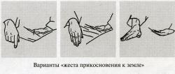 «Жест прикосновения к земле» (санскр. бхумиспаршамудра, кит. чу ди инь 觸地印) исполняется правой рукой в трех основных положениях: ладонь обращена к зрителю тыльной стороной и опущена вытянутыми пальцами вниз; ладонь с вытянутым указательным пальцем; кисть руки с пальцами, обращенными вправо, расположена перпендикулярно земной поверхности. Таким жестом, по преданию, Будда вызвал из земных недр духов земли, уничтоживших злых демонов, посланных против него Марой ― царем демонов. По другой легенде, Будда указывает на землю как свидетеля достижения им состояния просветления.