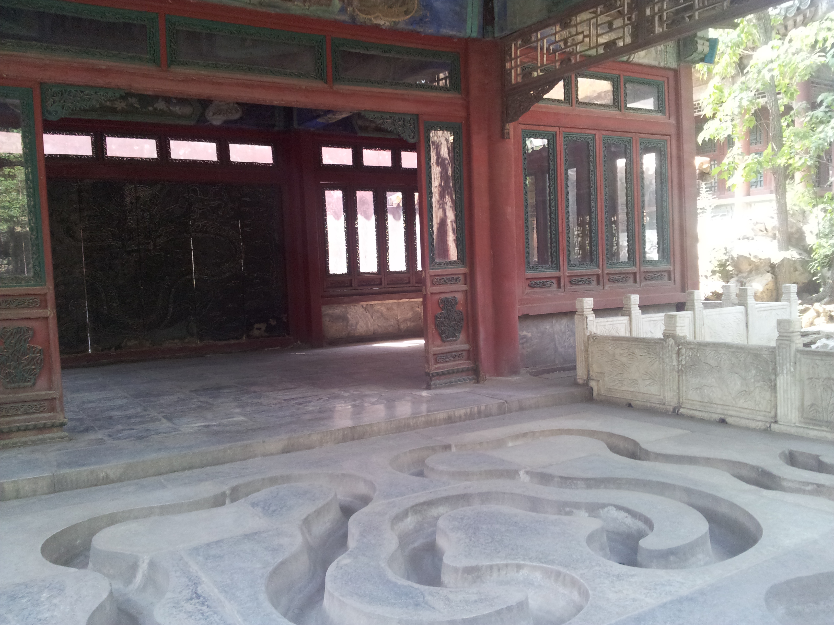 Люшуйинь. В наши дни от беседки осталось квадратное основание с извилистым каналом на полу. Сзади находится искусственная горка с водопадом, откуда вода поступала в канал, а затем обратно в озеро.