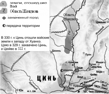 В 330 г. до н.э. началась череда военных конфликтов: войска Цинь окружили вэйские города Цзяо и Цюйво[8], которые занимали выгодные позиции на западной границе Вэй в месте выхода р. Хуанхэ из ущелья Саньмэнься – являвшиеся воротами при выходе на Великую Равнину. Чтобы сохранить за собой Цзяо, Сян-вану пришлось отдать Цинь часть вэйских земель к западу от Хуанхэ [1, гл. 44, с. 1848; 2, т. 6, с. 87]. Но в 329 г. циньская армия продолжила марш вглубь вэйских земель, захватив города Пиши, расположенный в низовьях р. Фэньшуй, и упомянутый ранее Цзяо [1, гл. 44, с. 1848; 2, т. 6, с. 87]. Тем самым были заняты земли бывшего царства Цзинь от основания П-образного изгиба р. Хуанхэ до истоков р. Фэньшуй.