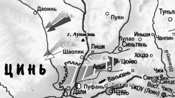 В 307 г. до н.э., циньское войско осадило уже упоминавшийся выше г. Пиши, т.е. циньцы продвигались дальше по Фэньхэ [1, гл. 44, с. 1852; 2, т. 6, с. 89]. В этот раз попытка взять город оказалась неудачной. В 303 г. циньцы, продолжая планомерно поглощать земли Вэй, захватили город Пуфань (в 302 г. до н.э., вернули его), находившийся на выходе Хуанхэ из ущелья Саньмэнься на Великую Равнину, и г. Фэнлин, расположенный близ горного прохода Тунгуань, ведущего в долину р. Вэйхэ [1, гл. 5, с. 210; 2, т. 2, с. 46].