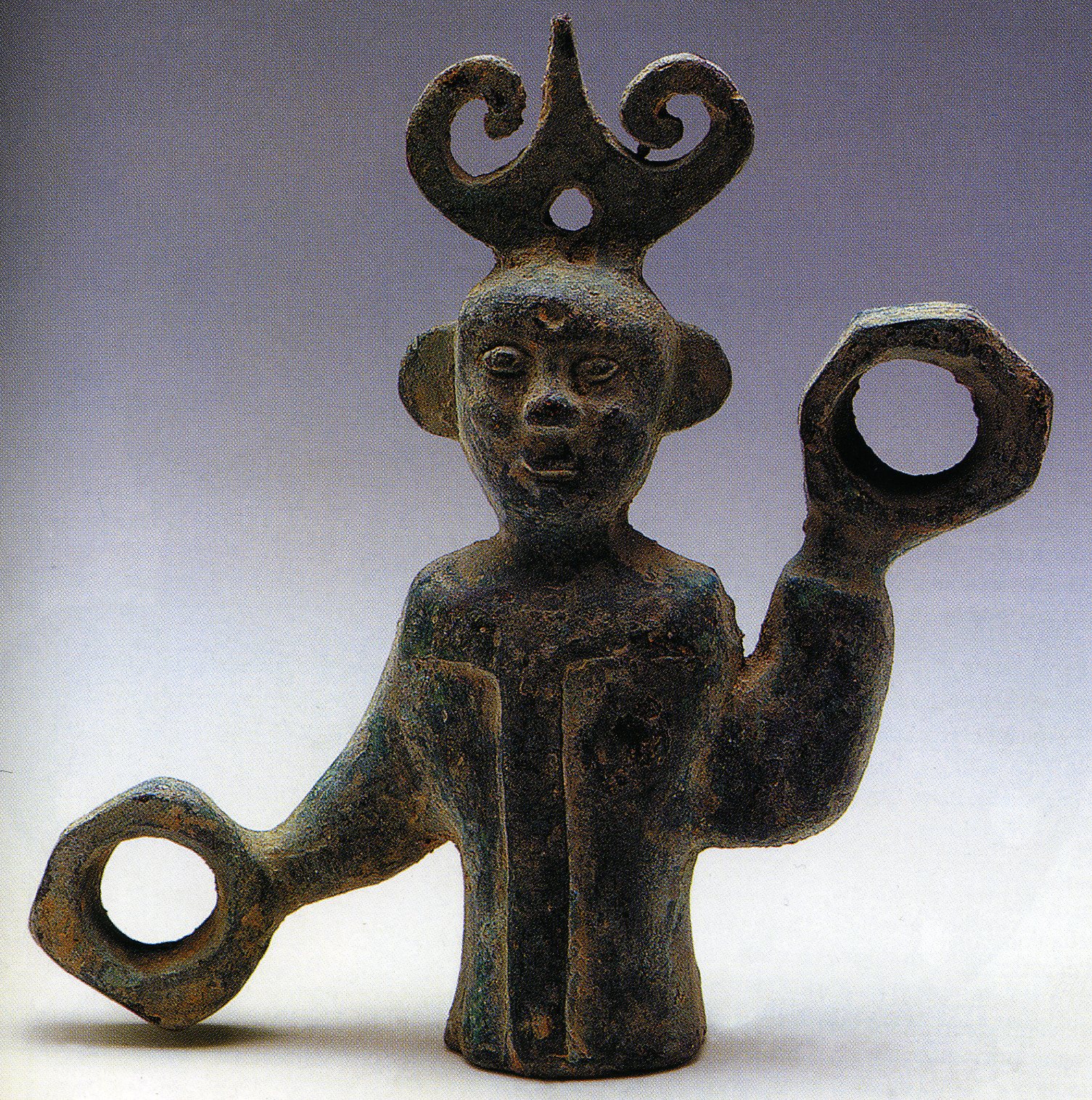 Женская фигура с короной на голове. Бронза, литье. Эпоха Западная ЧжоуКомплекты бронзовых сосудов были обнаружены не только в погребениях и местах расположения святилищ, но и в тайниках, где их прятали в случае неожиданного переезда владельцев на новое место. Таким образом, сегодня наука располагает богатейшим фактическим материалом, дающим возможность в деталях восстановить историю развития древнекитайского бронзолитейного дела и связанные с ним художественные традиции.