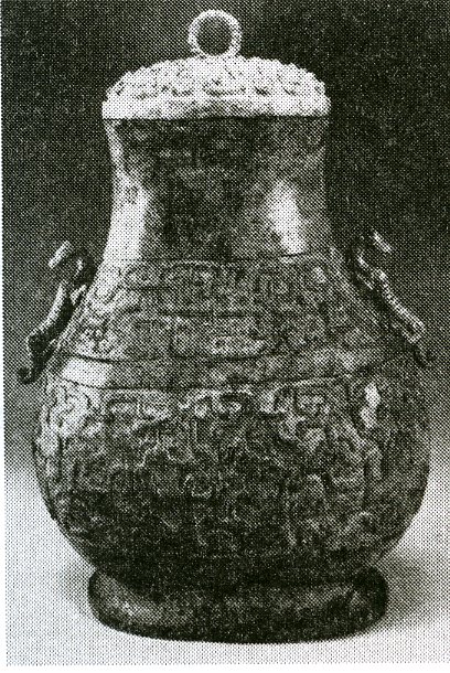 К важнейшим новациям чжоуского бронзолитейного ремесла и оформительского искусства относится изобретение техники инкрустации бронзы благородными металлами. Инкрустация поверхности бронзовых изделий бирюзой и другими материалами практиковалась еще в иньскую эпоху. Особым своеобразием отличался способ «углубленного орнамента с черным наполнителем», состоявший в заполнении углублений между выпуклыми элементами литого орнамента веществом черного цвета, благодаря чему рельефы кажутся обведенными жирными контурными линиями. Точный химический состав этого вещества установить пока не удалось, предположительно, его делали из необработанного лака, в который добавляли уголь, кварц и медь. История развития техники инкрустации благородными металлами прослеживается с VII–VI вв. до н.э., причем, сначала ею, видимо, овладели мастера царства Чу. Первым изделием, украшенным золотой инкрустацией (изображающей шесть фигур фантастических существ в сочетании с геометрическим узором) сегодня признан сосуд (высота 11,5 см, диаметр устья 22 см), найденный в 1997 г. в погребении на территории пров. Хубэй. В декоративно-прикладном искусстве центральных районов Китая первоначально (в VI – сер. V в. до н.э.) для инкрустации бронзы использовалась медь, а наибольшую популярность приобрели зооморфные мотивы, что указывает, по мнению исследователей, на возможность заимствования этой техники от народностей скифо-сибирского мира. Следующий этап развития техники инкрустации, ознаменовавшийся переходом от зооморфных мотивов к геометрическим и растительным орнаментам и использованием благородных металлов, а также бирюзы и малахита, соотносится с серединой V — серединой IV в. до н.э., после чего инкрустированные бронзы стали производить в Китае повсеместно.