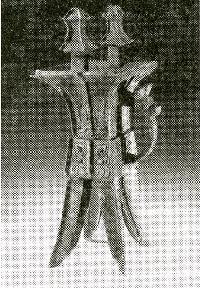 юэ. Поэтому неудивительно, что секиры постоянно входят в погребальный инвентарь иньской знати и обычно имеют богатое художественное оформление, будучи отделанными рельефным и сквозным декором, мотивами которого нередко выступают зооморфно-фантазийные личины, подобные маске-