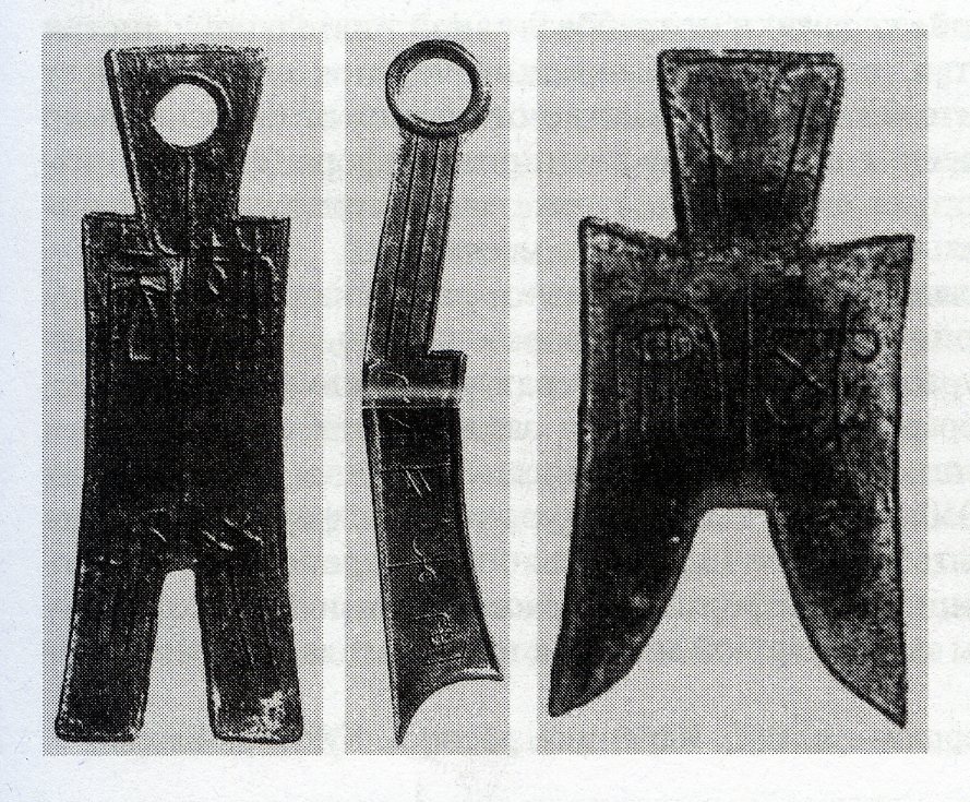 Древнекитайские бронзовые монетыК числу наиболее специфических древнекитайских бронзовых изделий относятся и монеты, которые вошли в обращение в IX–VIII вв. до н.э. Вначале они повторяли собой форму предметов, которые употреблялись во времена меновой торговли в качестве товаро-денег, например, сельскохозяйственных орудий — лопаты, мотыги, и орудий труда — ножей, пряслиц, либо, подобно музыкальным инструментам, имели особое ритуальное значение.