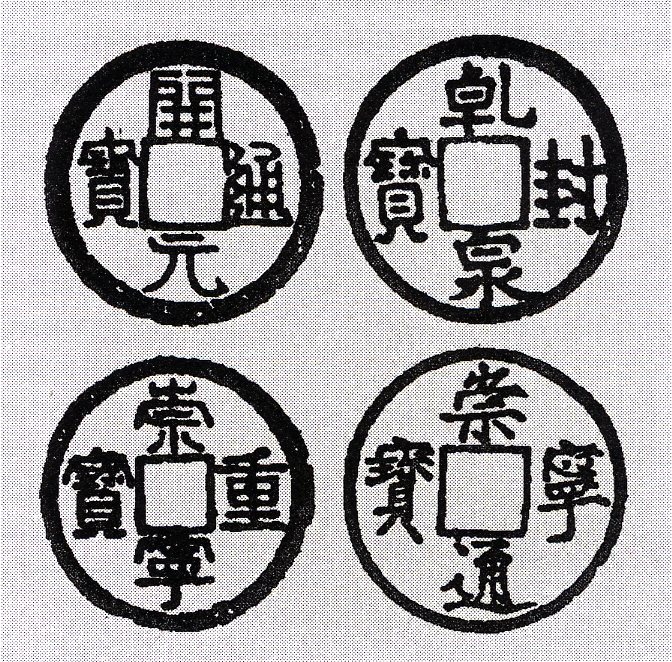 Монеты-цянь X-XII вв. с легендами, выполненными в различных каллиграфических почеркахМонета-