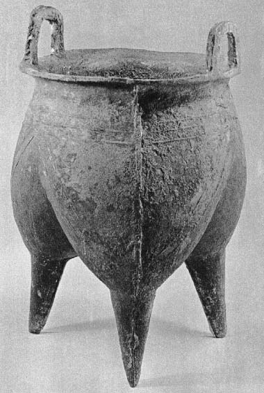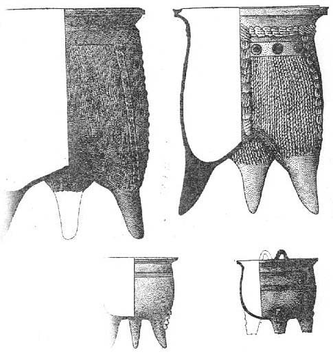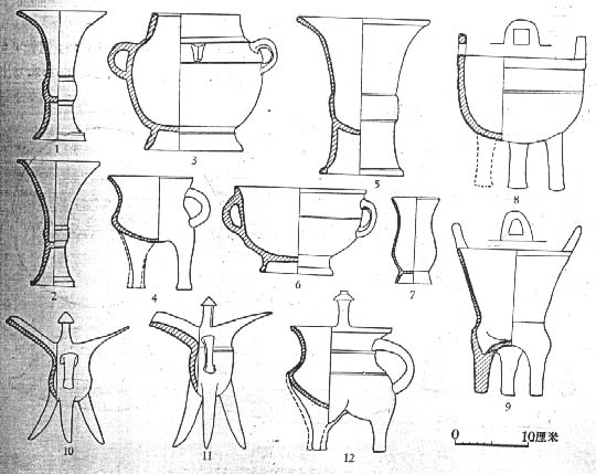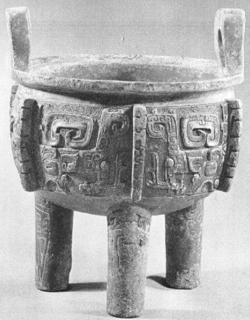 В археологических комплексах шан-иньского времени встречаются сходные по формам или орнаментации предметы, изготовленные из различных материалов (рис. 1-6). Рис. 1. Керамические сосуды, подражающие бронзовым, из раскопок Западного сектора Инь-сюя (см. [8, стр. 79]).Рис. 1. Керамические сосуды, подражающие бронзовым, из раскопок Западного сектора Инь-сюя (см. [8, стр. 79]).Автору статьи не известны специальные исследования, посвященные вопросу взаимовлияния различных производств в эту эпоху[1]; принято считать, что  сначала керамические формы копировались в металле, а затем шел обратный процесс имитации бронзовых изделий в гончарном производстве[2]. В отдельных случаях археологи фиксируют подражание металлическим изделиям, прежде всего, в керамике (см. [8, с. 61]). Данная статья ставит целью проследить влияние бронзовых изделий на предметы, изготовленные из других материалов, и поиск возможных причин этого явления.