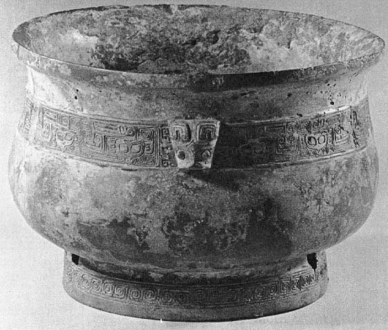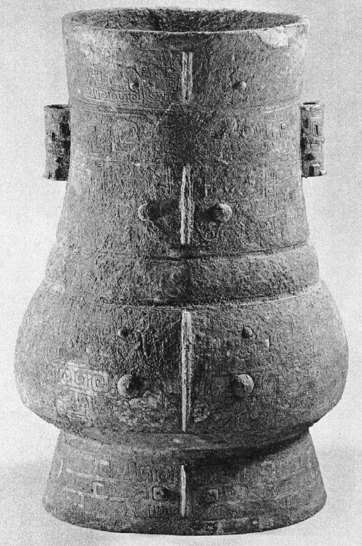 Рис. 3. Литейные швы и их имитации: № 2. Бронзовый сосуд (см. [4, ч/б. илл. 240])Рис. 3. Литейные швы и их имитации: № 2. Бронзовый сосуд (см. [4, ч/б. илл. 240])На сосудах эпохи Шан-Инь часто встречаются более или менее выпуклые вертикальные выступы, часто одновременно являющиеся осью симметрии для орнамента, покрывающего сосуд (рис. 3.2, 3.5). Для объяснения происхождения этих выступов следует обратиться к производственному процессу изготовления  металлических сосудов.