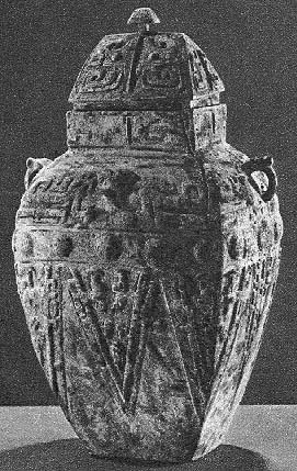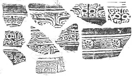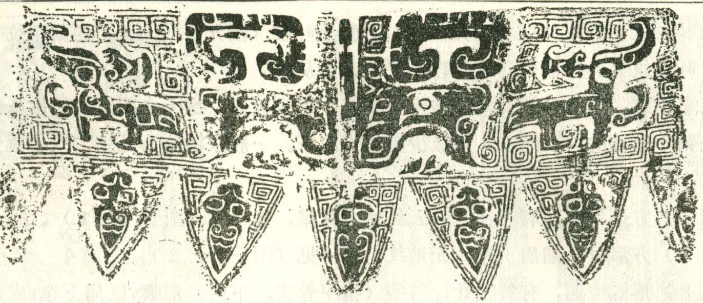 Рис. 2. Орнаментация сосудов: № 4. Каменная крышка (см. [7, ч/б. илл. CLXIX, № 6])Рис. 2. Орнаментация сосудов: № 4. Каменная крышка (см. [7, ч/б. илл. CLXIX, № 6])Переходя к орнаментации, следует обратить внимание на несколько особенностей оформления бронзовых сосудов. Прежде всего, орнамент располагается на сосудах вертикальными поясами, иногда тонкими, так что большая часть поверхности остается гладкой (рис. 2.1, 5.1); в других случаях несколько  последовательно расположенных полос орнамента покрывают практически всю поверхность сосуда (рис. 2.7, 3.5)[6]. Рис. 2. Орнаментация сосудов: № 7. Орнамент на керамических сосудах (см. [5, рис. 31 (верхний фрагмент)])Рис. 2. Орнаментация сосудов: № 7. Орнамент на керамических сосудах (см. [5, рис. 31 (верхний фрагмент)])Наиболее распространенным мотивом являются маски тао-тэ различной степени схематизации (рис. 2.7, 3.2, 5.1); все остающееся свободным от основного рисунка место заполняется спиралями с прямыми или скругленными углами (рис. 2.7). Рис. 2. Орнаментация сосудов: № 9. Керамический сосуд (см. [8, илл. 8, № 2])Рис. 2. Орнаментация сосудов: № 9. Керамический сосуд (см. [8, илл. 8, № 2]) Часто встречаются рельефные изображения: верхняя часть вертикальных ручек оформляется в виде головы животного, из пасти которого она начинается  (рис. 2.5, на рисунках 2.8 голову животного трудно увидеть за счет плохого качества иллюстрации); ручки крышек сосудов изображаются в виде дракона (рис. 2.3); на центральной поверхности сосуда помещаются рельефные звериные морды (рис. 2.1, 2.8)[7]. Бесспорных доказательств первичности применения всех этих особенностей в металле нет, поскольку эти детали не связаны напрямую с производственным процессом. Рис. 2. Орнаментация сосудов: № 8. Орнамент на бронзовом сосуде (см. [7, стр. 22, рис. 11, № 1])Рис. 2. Орнаментация сосудов: № 8. Орнамент на бронзовом сосуде (см. [7, стр. 22, рис. 11, № 1])Тем не менее, можно высказать предположение о том, что влияние шло именно от бронзовых изделий, поскольку в металле подобная орнаментация легко воспроизводится при отливке, в то время как прорисовка или моделирование керамики или резьба по камню и кости гораздо более трудоемкий процесс. В любом случае, все вышеперечисленные особенности орнамента встречаются на керамике (рис. 2.2, 2.6, 2.9) и изделиях из камня (рис. 2.4).