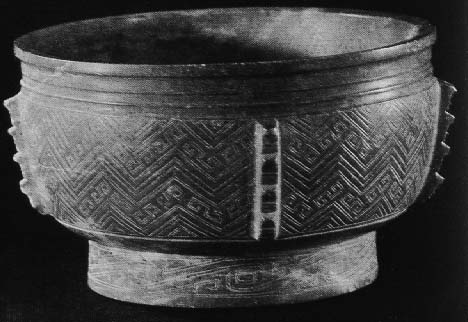 Рис. 2. Орнаментация сосудов: № 1. Керамический сосуд (см. [10, стр. 215, илл. 6, № 11])Рис. 2. Орнаментация сосудов: № 1. Керамический сосуд (см. [10, стр. 215, илл. 6, № 11])Не останавливаясь на вопросе о сходстве форм металлических и керамических сосудов, относительно которых могут существовать различные мнения о направлении копирования, следует отметить некоторые бесспорные случаи воспроизведения бронзовых моделей в гончарном производстве. Рис. 2. Орнаментация сосудов: № 2. Бронзовый сосуд (см. [4, ч/б. илл. 274])Рис. 2. Орнаментация сосудов: № 2. Бронзовый сосуд (см. [4, ч/б. илл. 274])При раскопках в западном секторе Инь-сюя[3] в ряде погребений были обнаружены керамические изделия, копирующие металлические образцы, предположительно относящиеся к четвертому периоду Инь-сюя[4];  в отчете о раскопках они приводятся в отдельной иллюстрации (рис.1). Рис. 2. Орнаментация сосудов: № 3 Бронзовый сосуд (см. [7, стр. 74, рис.49, № 2])Рис. 2. Орнаментация сосудов: № 3 Бронзовый сосуд (см. [7, стр. 74, рис.49, № 2])Исследователи указывают на существование социальных причин для появления подобных изделий, но никаких объяснений относительно этого утверждения в публикации не дано (см. [8, с. 113]). Рис. 2. Орнаментация сосудов: № 5. Ручка бронзового сосуда (см. [7, ч/б. илл. XXXVI, № 1])Рис. 2. Орнаментация сосудов: № 5. Ручка бронзового сосуда (см. [7, ч/б. илл. XXXVI, № 1])Материалы из Эрлитоу[5] наглядно демонстрируют сходную тенденцию имитации бронзовых образцов в керамике: по форме сосуды № 1 и № 2 копируют металлические кубки № 4 и № 6 и настолько отличаются от остальной керамики, представленной в таблице, что по внешнему виду их можно принять за бронзовые (рис. 6). Рис. 2. Орнаментация сосудов: № 6. Бронзовый сосуд (см. [7, ч/б. илл. XXXII, № 1])Рис. 2. Орнаментация сосудов: № 6. Бронзовый сосуд (см. [7, ч/б. илл. XXXII, № 1])Кроме этого, следует обратить внимание на длинные тонкие ножки кубков; в металле за счет прочности материала они сохраняются в изначальном состоянии на протяжении веков, а в глине легко ломаются и мало способствуют удобству практического использования сосуда (рис. 8).