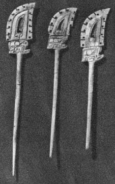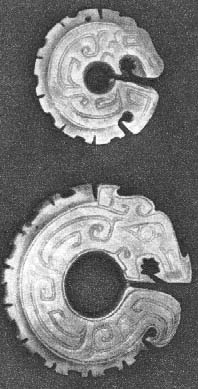 Рис. 4. Декоративное оформление закраин: № 1. Бронзовые ножи (см. [7, ч/б. илл. LXV, № 1, 2])Рис. 4. Декоративное оформление закраин: № 1. Бронзовые ножи (см. [7, ч/б. илл. LXV, № 1, 2])Рис. 4. Декоративное оформление закраин: № 1. Бронзовые ножи (см. [7, ч/б. илл. LXV, № 1, 2])Рис. 4. Декоративное оформление закраин: № 1. Бронзовые ножи (см. [7, ч/б. илл. LXV, № 1, 2])Разъяснить эту ситуацию могут письменные источники более позднего времени. По материалам памятников династии Чжоу, в особенности относящихся к периодам Чуньцю и Чжаньго, можно сделать заключение, что бронзовые сосуды широко применялись в ритуальных практиках, которые устанавливали и поддерживали определенную иерархию в обществе. Рис. 4. Декоративное оформление закраин: № 2. Ножи из яшмы (см. [7, цв. илл. XX’, № 3])Рис. 4. Декоративное оформление закраин: № 2. Ножи из яшмы (см. [7, цв. илл. XX’, № 3])Рис. 4. Декоративное оформление закраин: № 3. Костяные шпильки (см. [7, ч/б. илл. CLXXX, № 1 (выборочно)])Рис. 4. Декоративное оформление закраин: № 3. Костяные шпильки (см. [7, ч/б. илл. CLXXX, № 1 (выборочно)])При применении сосудов в различных ситуациях существовали многочисленные ограничения по количеству, формам и размерам. Не пытаясь перенести эти установления на время правления династии Шан-Инь, следует отметить, что археологические материалы подтверждают важное значение бронзовых сосудов. Рис. 4. Декоративное оформление закраин: № 4. Яшмовые подвески (см. [7, ч/б. илл. CIV, № 2])Рис. 4. Декоративное оформление закраин: № 4. Яшмовые подвески (см. [7, ч/б. илл. CIV, № 2])Рис. 4. Декоративное оформление закраин: № 5. Яшмовые секиры (см. [7, ч/б. илл. CXVI, № 1])Рис. 4. Декоративное оформление закраин: № 5. Яшмовые секиры (см. [7, ч/б. илл. CXVI, № 1])В наиболее крупных и богатых сопроводительным инвентарем погребениях обнаруживается значительное количество бронзы, так, что именно по количеству и качеству металлических изделий зачастую судят о социальном положении владельца могилы.