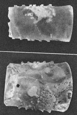 Рис. 3. Литейные швы и их имитации: № 5. Бронзовый сосуд (см. [4, ч/б. илл. 335])Рис. 3. Литейные швы и их имитации: № 5. Бронзовый сосуд (см. [4, ч/б. илл. 335])В китайском бронзолитейном производстве, как известно по раскопкам мастерских в Чжэнчжоу[8]и Инь-сюе, отливка сосудов производилась в разъемных глиняных формах, состоящих из нескольких вертикальных и горизонтальных секций, и одного или нескольких сердечников (см. [3]). Рис. 3. Литейные швы и их имитации: №  1. Бронзовый сосуд (см. [4, ч/б. илл. 36])Рис. 3. Литейные швы и их имитации: №  1. Бронзовый сосуд (см. [4, ч/б. илл. 36])Чтобы остывший сосуд можно было легко вынуть из формы, для отливки круглых сосудов чаще всего использовалось деление на три вертикальных секции, для прямоугольных – на четыре. Рис. 3. Литейные швы и их имитации: № 4. Керамические сосуды (см. [5, рис. 2, № 1, 2, 5, 7])Рис. 3. Литейные швы и их имитации: № 4. Керамические сосуды (см. [5, рис. 2, № 1, 2, 5, 7])На стыке глиняных форм, если они не были вплотную подогнаны друг к другу, могли происходить более или менее значительные смещения, ведущие к образованию видимых невооруженным взглядом литейных швов (рис. 3.1). Для сокрытия подобного недостатка излишки металла либо скалывали, либо обрабатывали таким образом, что эти швы производили впечатление декоративных выступов (рис. 3.2). Рис. 3. Литейные швы и их имитации: № 6. Керамический сосуд (см. [8, илл. 8, № 3Рис. 3. Литейные швы и их имитации: № 6. Керамический сосуд (см. [8, илл. 8, № 3В дальнейшем подобные декоративные швы начинают применяться на центральных плоскостях сосудов, вне зависимости от производственной необходимости (рис. 3.2; общее количество выступов на этом сосуде – шесть: три из них находятся на месте литейных швов, и три выполняют чисто декоративные функции). Рис. 3. Литейные швы и их имитации: № 3. Сосуд из яшмы (см. [7, цв. илл. XIV, № 1])Рис. 3. Литейные швы и их имитации: № 3. Сосуд из яшмы (см. [7, цв. илл. XIV, № 1])Верхний край выступов украшали прорезями, и такие же прорези появляются на закраинах плоских предметов, ножей и оружия (рис. 3.2, 4.1). Имитации литейных швов, декоративных выступов и прорезных закраин часто встречается на керамике (рис. 3.4, 3.6), изделиях  из камня (рис. 3.3, 4.2, 4.4, 4.5) и кости (рис. 4.3).