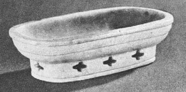 Рис. 5. Образцы отверстий в поддоне: № 1. Бронзовый сосуд (см. [4, ч/б. илл. 24])Рис. 5. Образцы отверстий в поддоне: № 1. Бронзовый сосуд (см. [4, ч/б. илл. 24])Рис. 5. Образцы отверстий в поддоне: № 4. Керамические сосуды (см. [5, рис. 9, № 5, 6])Рис. 5. Образцы отверстий в поддоне: № 4. Керамические сосуды (см. [5, рис. 9, № 5, 6])При осмотре бронзовых сосудов на поддоне часто можно заметить отверстия, круглые, крестообразные или овальной формы, в нижней части изделия (рис. 2.1, 5.1). Их появление обусловлено тем, что для образования полого поддона нижняя часть сосуда при отливке была заполнена сердечником, который должен был опираться на стенки формы, чтобы в образовавшийся зазор мог проникнуть металл для формирования стенок поддона. Рис. 5. Образцы отверстий в поддоне: № 2. Яшмовый сосуд (см. [7, ч/б. илл. LXXXIII, № 4])Рис. 5. Образцы отверстий в поддоне: № 2. Яшмовый сосуд (см. [7, ч/б. илл. LXXXIII, № 4])Подобные отверстия существуют и на сосудах из керамики (рис. 5.3, 5.4) и камня (рис. 5.2), и также являются имитацией особенностей изделий из бронзы.
