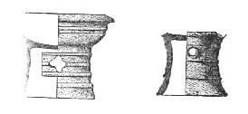 Рис. 5. Образцы отверстий в поддоне: № 3. Керамические сосуды (см. [5, рис. 6, № 5, 11])Рис. 5. Образцы отверстий в поддоне: № 3. Керамические сосуды (см. [5, рис. 6, № 5, 11])Копирование вышеперечисленных особенностей бронзовых изделий – форм и орнаментации сосудов, литейных швов, декоративных закраин и отверстий в поддоне – в керамике, камне или кости не имело производственной обусловленности; в большинстве случаев имитация была значительно более трудоемкой по сравнению со стандартными методами изготовления изделий.