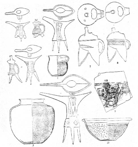 Рис. 6. Керамика и бронза из Эрлитоу: 1, 2, 3, 5, 7, 8, 10 керамика; 4, 6 бронза; 9 фрагмент лакированного изделия (см. [11, стр. 203])Рис. 6. Керамика и бронза из Эрлитоу: 1, 2, 3, 5, 7, 8, 10 керамика; 4, 6 бронза; 9 фрагмент лакированного изделия (см. [11, стр. 203])Что касается каменных сосудов, прежде всего из нефрита, то имитация в данном случае не несла социальной нагрузки, поскольку роль этих сосудов в ритуалах была, возможно, даже более значимой, чем изделий из бронзы. Находки таких сосудов редки, и они присутствуют только в богатых погребениях с большим количеством бронзовых предметов. В данном случае подражание формам и орнаментации металлических сосудов имело, скорее всего, декоративные функции, а также могло быть данью традиции.