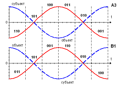 В этом пассаже мы видим следующий числовой расклад: 8 видов взаимодействия, 2 принципа, 2 состояния (активность/пассивность). Но два принципа в двух позициях дают не восемь, а четыре комбинации взаимодействия. Автор пробует разрешить эту ситуацию, встраивая третий элемент в бинарную оппозицию: вводя три компонента взаимодействия (причинный, процессуальный и результативный) и добавляя медиатор (М) взаимодействия. В итоге получается следующая конструкция: