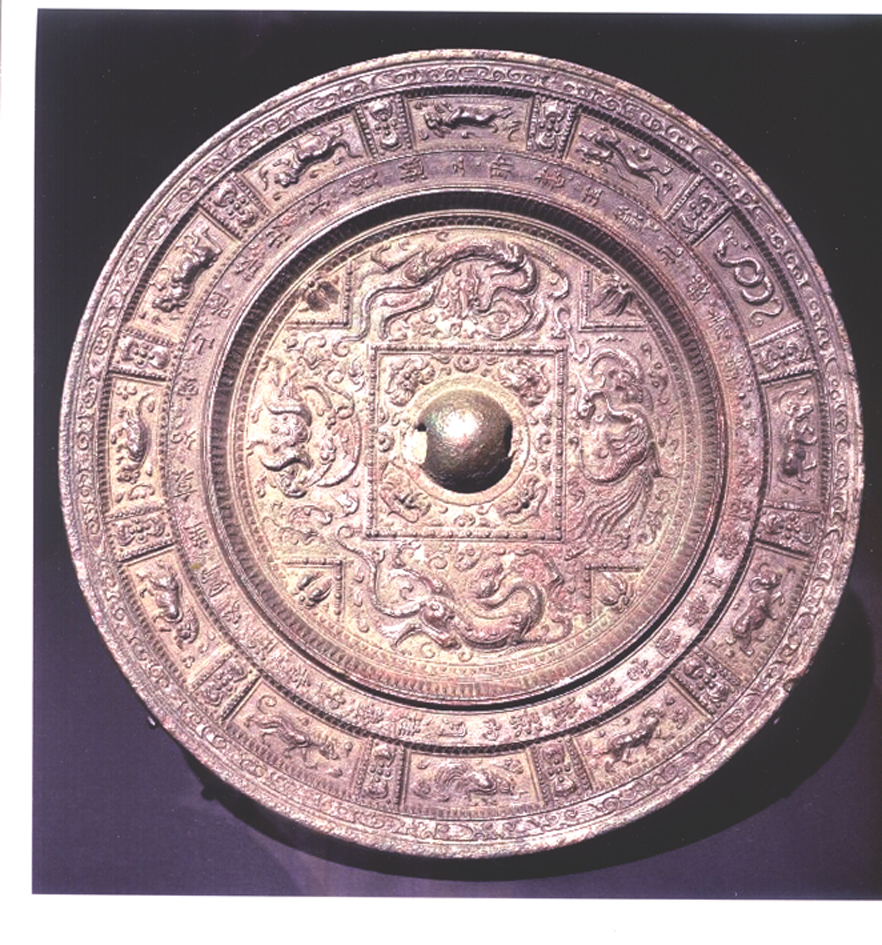 Поскольку свидетельства, когда 12-летний животный цикл был известен в Китае, относятся к более раннему времени, чем датировки тюркских надписей или переводов внешних источников, остаётся сомнение относительно места его появления. Тем не менее, что цикл вероятней всего не китайский, подсказывают и даже показывают бронзовые зеркала. И прежде всего зеркало из собрания Государственного Русского музея в Санкт-Петербурге, подробно описанное в 1926 г. хранительницей Отдела этнографии (ныне Российский Этнографический музей) Государственного Русского музея М.П. Лавровой. Описание позволяет ориентироваться в сложном построении изображения на орнаментованной поверхности зеркала. В центре композиции находится квадрат, окружённый «рамкой, каждая сторона которой разбита на три части при посредстве маленьких кнопок ...; в каждой из этих частей рамки находится по иероглифу, – в общей сложности их двенадцать; они представляют собой обозначения двенадцати знаков зодиака» [6, с. 3]. Термином «знаки зодиака» автор цитируемой публикации характеризует 12 «земных ветвей», представленных, вероятно, древним письмом либо в стиле, не лишённом изобразительности. Так, шестой циклический знак