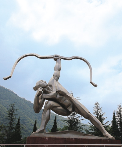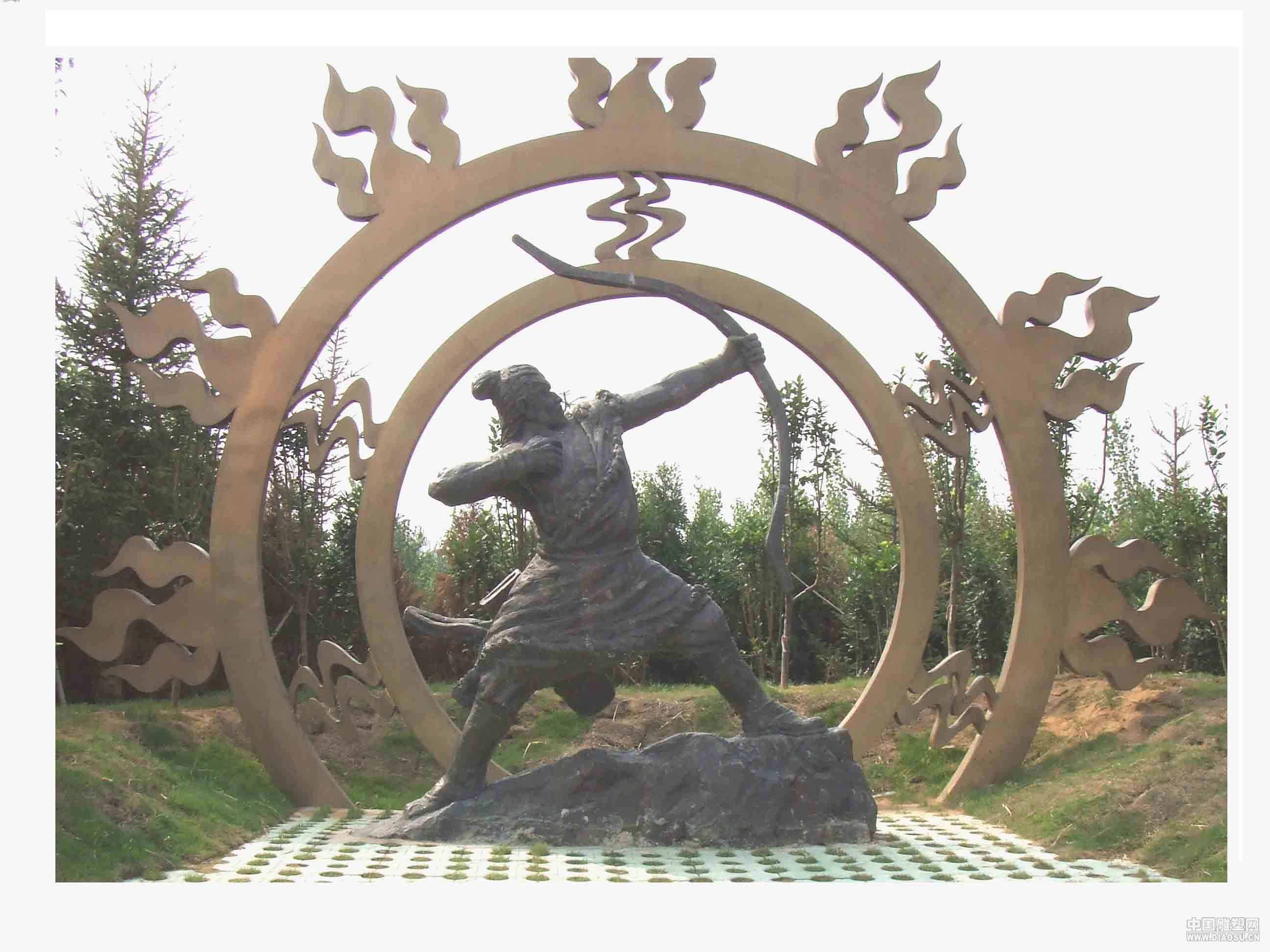 Скульптура стрелка (Хоу) ИСкульптура стрелка (Хоу) ИСогласно смыслу двух составляющих иероглифа «И»: 1) «юй [5]» - «перья, крылья, оперенные стрелы» и 2) «гун [7] » - «сложенные и воздетые кверху руки [для приветствия или пожелания]», - это имя этимологически может означать: 1) Охотник-лучник, 2) Стрелок из лука [в ритуале пускания стрелы в солнце], 3) Воздымающий руки [для добывания] крыльев [солнечного ворона]. Биномные варианты  Хоу И и И И, соответственно, означают: Ведающий Охотой/Стрельбой из лука и (Варварски/Справедливо) разящий Охотник/Стрелок из лука. И упоминается во всех основных письменных памятниках второй пол. I тыс. до н.э.: «Лунь юй» («Теоретические речи»), «Гуань-цзы», «Мо-цзы», «Мэн-цзы», «Сюнь-цзы», «Люй-ши чунь цю» («Вёсны и осени господина Люя»), «Хуайнань-цзы», «Шань хай цзин» («Канон гор и морей»), у Ян Сюна, Цюй Юаня и др. Его имя часто сопровождается постоянными эпитетами «искусный/умелый/добрый стрелок из лука» (шань шэ 善射) и «страстный охотник» (инь тянь 淫佃). В «Мо-цзы» и «Люй-ши чунь цю» он представлен культурным героем, к-рый изобрел лук и стрелы, в «Сюнь-цзы» и «Шань хай цзине» - первым, кто овладел искусством лучника, а в «Мэн-цзы» (VI A, 20) – тем, кто «научил/учил людей стрелять из лука» (цзяо жэнь шэ 教人射), чему соответствует присоединение к его имени определения «наставник/учитель» (ши [22]) в первом полном толково-этимологическом словаре «Шо вэнь цзе цзы» («Изъяснение знаков и анализ иероглифов», ок. 100) Сюй Шэня.