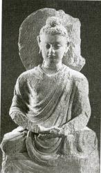 История возникновения буддийского культового изобразительного искусства и формирование его иконографических принципов связывается с гандхарской и матхурской художественными школами. Первая из них возникла на рубеже эр в северо-западной окраине нынешней Индии, бывшей тогда центром могущественной Кушанской империи (I–IV вв. н.э.), в которую к моменту ее расцвета (I–III вв.) входила Северная Индия, большая часть Афганистана, Пакистана и некоторые районы современных центрально-азиатских государств. Памятники гандхарского искусства сохранились в самой Индии, Пакистане (г. Пешавар), Афганистане и на северном берегу Амударьи. Возникновение этой школы стало прямым следствием религиозной политики властей Кушанской империи, в первую очередь легендарного царя Канишки (I–II вв.), провозгласившего себя буддийским адептом, а буддийское вероучение (в варианте школы сарвастивады ― кит. саподобу 薩婆多部) — официальной идеологической системой страны. Художественные особенности гандхарской школы сформировались под сильным воздействием эллинистического, так называемого греко-бактрийского искусства, благодаря чему ее считают одной из прямых наследниц античной (греческой и римской) скульптуры. Разработанные в ней трактовки образа Будды (кит. Фо), используемые для передачи физического и духовного совершенства человека, сравнивают с эллинистическими художественными приемами, воплотившимися в образе Аполлона. Но, восприняв от греко-римского искусства идею и форму человекоподобных божественных персонажей, гандхарская школа использовала и национальный художественный опыт. В результате созданное в ней иконографическое направление объединило в себе эстетизм и реалистичность античной скульптуры с натурализмом индийской пластики.<em>Гандхарская школа. Статуя сидящего Будды (выс. 45 см, из коллекции Музея Гиме)</em>Гандхарская школа. Статуя сидящего Будды (выс. 45 см, из коллекции Музея Гиме)