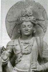 Традиция национальной индийской скульптуры восходит к культуре Хараппы (кон. III — нач. II тыс. до н.э.), составлявшей ядро общего культурно-исторического комплекса, получившего в науке название «индская цивилизация». Само же буддийское культовое искусство зародилось в III в. до н.э., в искусстве эпохи Маурьев (IV–II вв. до н.э.), когда в Индии возникло первое централизованное государство имперского типа, а буддизм получил статус государственной религии. Следствием этого явилось создание памятников буддийского культового зодчества — ступ, предшественниц китайских пагод (та ). Поверхности ступ украшались горельефными изображениями религиозных символов и древнеиндийских божественных персонажей. В них наметилась одна из главных специфических черт связанного с буддизмом культового искусства — наделение изображений и их отдельных элементов глубинным религиозно-философским смыслом, давшая начало формированию буддийской иконографии. Эту символичность восприняла и гандхарская школа, причем, национальные художественные корни сказались в ней даже сильнее, чем эллинистическое влияние. В отличие от греко-римской скульптуры, Будда в гандхарском искусстве не был лишь воплощением телесной красоты человека и объектом эстетического наслаждения: всем деталям его внешнего облика придавались символические значения.<em>Гандхарская школа. Статуя Бодхисаттвы (выс. 120 см, из коллекции Музея Гиме)</em>Гандхарская школа. Статуя Бодхисаттвы (выс. 120 см, из коллекции Музея Гиме)