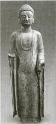 <em>Шаньдунская художественная школа; статуя стоящего Будды (выс. 120 см., дин. Северная Ци, 550−577)</em>Шаньдунская художественная школа; статуя стоящего Будды (выс. 120 см., дин. Северная Ци, 550−577)Своеобразие шаньдунской (в современной терминологии — «цинчжоуской») школы во многом объясняется особенностями местной историко-этнической ситуации. На протяжении IV–VI вв. эта территория попеременно попадала под власть Тоба Вэй и южно-китайских государств, а также служила прибежищем эмигрантам из северо-восточных, северных и северо-западных районов Китая, среди беженцев было немало чужеземцев, в том числе согдийцев. В результате в произведениях «цинчжоуской» школы прослеживается влияние самых разных художественных традиций, восходящих к матхурскому, центрально-азиатскому и южно-китайскому искусству.