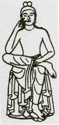 <em>«Поза задумчивости»</em>«Поза задумчивости»«Поза задумчивости» не имеет оригинального терминологического обозначения, и была, видимо, заимствована гандхарской школой из античной скульптуры. Персонаж показан в ней сидящим на троне, левая нога спущена, правая согнута в колене и лежит на колене левой ноги. Правая рука согнута в локте, опираясь на приподнятое колено, а ладонь с вытянутым указательным пальцем касается лица или доходит до прически. Левая рука, чуть согнутая в локте, свободно лежит на лодыжке правой ноги. В китайско-буддийском искусстве эта поза была распространена до X–XI вв., в основном в иконографии будды Майтрейи и бодхисаттвы милосердия Гуань-инь.