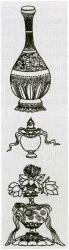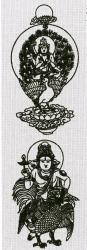 <em>Иконографические варианты изображения вазы</em>Иконографические варианты изображения вазыПредметы ритуально-церемониального и бытового предназначения образуют самый большой раздел атрибутов, в котором выделяется несколько первостепенных для буддийской иконографии вещей: зеркало, светильник, ваза, веревка и мухогонка. Зеркало (санскр. адарша, кит. цзин-цзы  鏡子) изображается, в соответствии с конструкцией, принятой в Китае, исключительно в виде металлического диска. Этот образ сохранил за собой и те символические значения, которыми зеркало наделялось в традиционной культуре, являясь олицетворением внутренней чистоты, способным высвечивать истинную сущность вещей и явлений и отпугивать злые силы. В буддийской литературе с зеркалом часто сравниваются глаза Будды. Вместе с тем, оно наглядно иллюстрирует иллюзорность феноменального мира и ложность восприятия, так как лишь отражает внешние реалии, не улавливая их субстанциональности. Светильник (санскр. дипа, кит. чжу [13] ) — в переносном смысле «светильник мудрости», озаряющий мир, и «лампада Закона», метафорическое обозначение Учения как маяка, указующего путь к спасению в «море страстей» (кит. юй-хай 欲海). Ваза (санскр. калаша, кит. пин [1] ) — условный термин, прилагаемый к сосудам различных категорий (собственно вазе, кувшину, нередко снабженному крышкой и носиком). Она служила символическим вместилищем в прямом смысле (например, емкостью для подношения Будде) или в образном выражении («вместилищем» Закона, Истины). В качестве самостоятельных атрибутов выступают: «ваза, наполненная амритой» («сосуд бессмертия», санскр. амритакалаша, кит. гань лу пин 甘露瓶), которая изображается в виде сосуда с крышкой и свешивающимися нитями бус и означает сосредоточение благих намерений и ниспадение в мир, подобно бусам, живительной влаги; ваза (сосуд) с крышкой, увенчанной драгоценностью-мани; сосуды с цветами (включая лотосы), знаменующие нравственное и физическое исцеление.