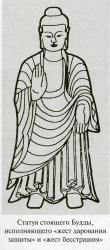 <em>Статуя стоящего Будды, исполняющего «жест дарования защиты» и «жест бесстрашия»</em> (прорисовка каменной скульптуры 2-й пол. VI в., пров. Шаньси)Статуя стоящего Будды, исполняющего «жест дарования защиты» и «жест бесстрашия» (прорисовка каменной скульптуры 2-й пол. VI в., пров. Шаньси)«Жест бесстрашия» символизирует внутреннюю силу Будды и способность Учения защитить все живое на земле и, кроме того, призывает живые существа преодолеть врожденное чувство страха, порождаемого внутренними сомнениями и противоречиями, а также угрозами, проистекающими из внешнего мира. «Жест дарования защиты» нередко сочетается с «жестом бесстрашия» в одном изображении «стоящих» и «сидящих» фигур, причем, первый тогда чаще исполняется правой, а второй — левой рукой.