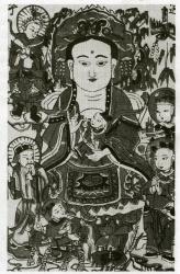 <em>Чадоподательница Гуань-инь</em>Чадоподательница Гуань-иньВ XVII–XVIII вв. в Китае утвердился принципиально новый вариант культа бодхисаттвы милосердия в роли Чадоподательницы Гуань-инь (Сун-цзы Гуань-инь 送子觀音, досл. «Гуань-инь, ниспосылающая детей»), в чем очевидно влияние образа Мадонны и иконографии христианской иконописи. В «простонародных картинах» (нянь-хуа 年畫) религиозного содержания и скульптурных изображениях Чадоподательница Гуань-инь неизменно предстает в облике женщины средних лет, сидящей на троне и держащей на коленях младенца.