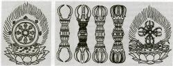 <em>Чакра с восемью спицами на цветке лотоса</em> (с гравюры-иллюстрации к китайско-буддийскому каноническому своду Трипитака) и <em>Иконографические варианты изображения ваджры</em>Чакра с восемью спицами на цветке лотоса (с гравюры-иллюстрации к китайско-буддийскому каноническому своду Трипитака) и Иконографические варианты изображения ваджрыЧакра имеет форму круга, разделенного на равные сектора радиусами-спицами, и явно восходит к универсальной для индоевропейского этнокультурного массива солярной символике. Этот предмет исходно был атрибутом образа «вселенского правителя» Чакравартина, служа главным знаком его державной власти. В буддийской традиции символика чакры намного расширилась, в зависимости от контекста обозначая круговорот бытия (Колесо Космоса), совершенство и непреложность Учения («Колесо Дхармы», кит. фа лунь 法輪), креативные способности Учения и буддийских божеств (приведение «колеса ситуации» в движение), неустрашимость и могущество Учения (подобно катящемуся колесу, сметает все препоны и уничтожает всех врагов) и, наконец, решимость личности продвигаться по пути самосовершенствования. В буддийской иконографии главенствующее положение занимает изображение чакры с восемью спицами — символа этапов «восьмеричного пути», из которых и состоит путь к нирване.