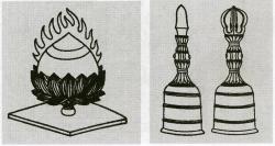 <em>Стандартный иконографический вариант мани в китайско-буддийском изобразительном искусстве </em>и <em>Иконографические варианты изображения колокола</em>Стандартный иконографический вариант мани в китайско-буддийском изобразительном искусстве и Иконографические варианты изображения колоколаДрагоценность-мани — образ неясного происхождения, который впервые фигурирует в легендах о царе-Чакравартине, называясь следующим, после чакры, знаком его державных полномочий, возможно, имевшим лунарную символику. В буддийской традиции мани преобразовалась в жемчужину, олицетворяя истинность Учения, искренность Будды и его готовность внимать мольбам, что и нашло отражение в китайском термине. Дальнейшая судьба образа мани в различных странах буддийского ареала сложилась неодинаково: так, в Тибете «мани» — это камни с начертанной или выгравированной на них мантрой, установленные в горах, на перевалах, рядом с храмами или памятными местами для обозначения сакрального пространства. В Китае образ мани объединился с образом «пылающей/огненной жемчужины» (хо чжу 火珠), возникшим в местном орнаментальном искусстве еще в V–III вв. до н.э. в качестве графического образа звука грома или стилизованного изображения шаровой молнии, на что указывают его стандартные изображения, варьирующие рисунок круга с языками пламени. В китайско-буддийской иконографии мани изображается в виде предмета сферической, овальной или сердцевидной формы, который обычно охвачен языками пламени и покоится на цветке лотоса. Каменные и металлические изображения мани широко используются в китайско-буддийском культовом зодчестве, их включают в композицию наверший пагод.