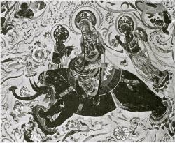 Число зооморфных изображений животных и птиц, служащих атрибутами, достаточно велико. Наибольшей популярностью пользуются образы льва (ши-цзы 獅子) и «белого слона» (бай-сян 白象), которые также были заимствованы буддийской традицией из более ранних индийских верований. <em>Бодхисаттва Самантабхарда на слоне</em> (фрагмент стенописи пещерного монастыря Могао, 2-я пол. VII в.)Бодхисаттва Самантабхарда на слоне (фрагмент стенописи пещерного монастыря Могао, 2-я пол. VII в.)Первый из них был изначально связан с институтом верховной власти, а в собственно буддийской образной системе превратился в символ Будды как духовного властителя мира, олицетворяя верховенство и внутреннюю мощь («бесстрашие») Учения. Образа слона восходит к нескольким персонажам древнеиндийской мифологии: «космическим» слонам (дигнаги), на спинах которых, согласно древнейшим индийским космологическим представлениям, покоится земная поверхность; слону-перевозчику бога Индры; божеству мудрости Ганеша, который изображался в виде человека с головой слона. «Белый слон» является и одним из атрибутов царя-Чакравартина. В буддийской образной системе слон олицетворяет мудрость, внутреннюю силу и верховенство Учения.