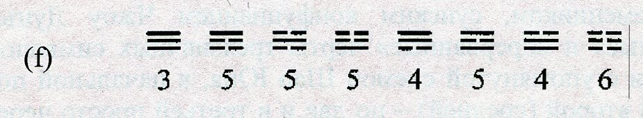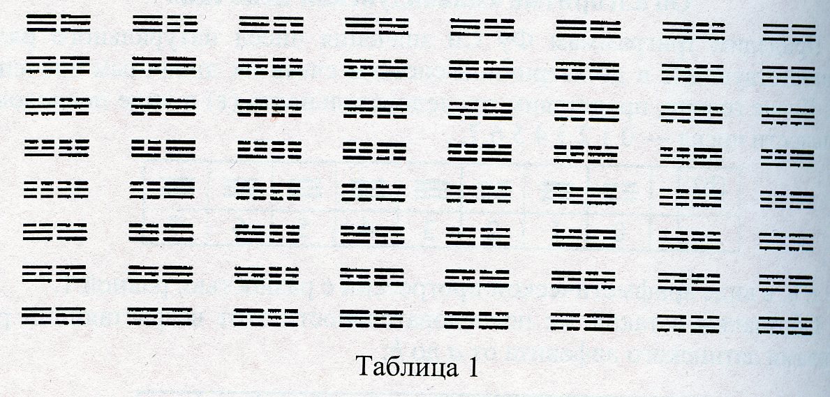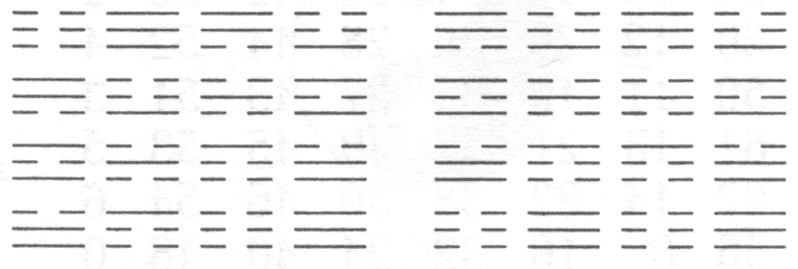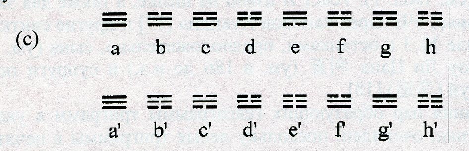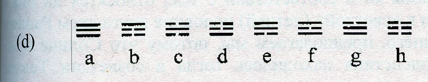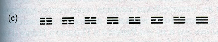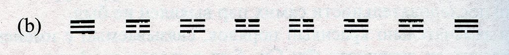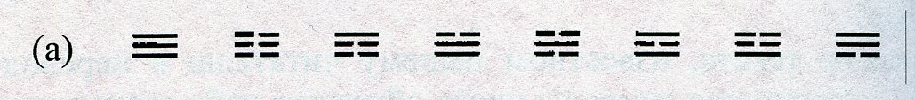[2]. «Полные» и «прерванные» черты трехзначных символов идут, в соответствии с упомянутой схемой Шао Юна, в начальной позиции по четыре, во второй (средней) — по две и в третьей просто чередуются. Во-вторых, этот порядок правильный: цепочка представляет собой последовательный ряд двоичных чисел, а