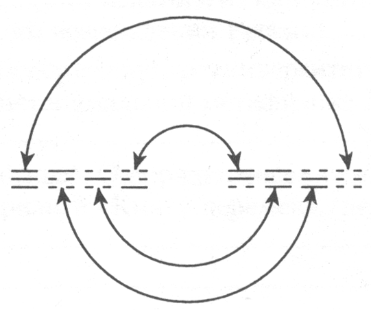 Схема сЕсли расположение парных триграмм в каждой из двух данных цепочек рассматривать в качестве конституирующего их признака, то в мавандуйской цепочке такие триграммы отстоят друг от друга на одинаковое расстояние, а вот в цепочке Фу Си они расходятся. По этому признаку мавандуйский порядок можно назвать