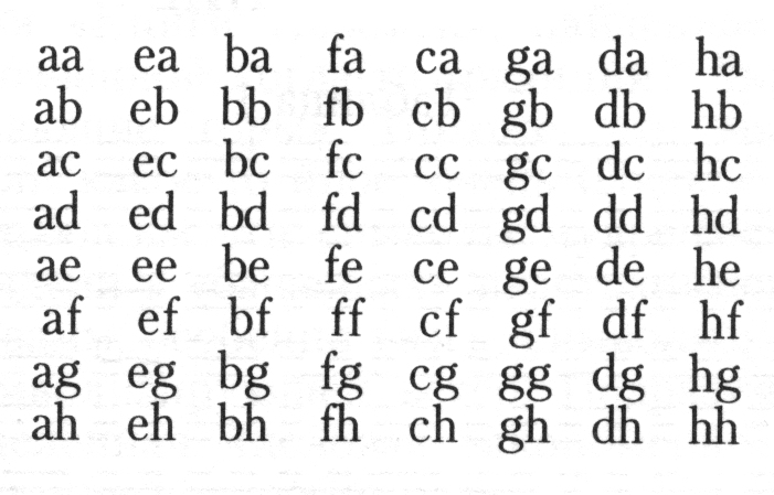 Таблица 2Расположив каждую четную триграмму последовательности (a) под нечетной, ей предшествующей (мы имеем в виду четные или нечетные позиции триграмм), или поставив последние в цепочке (b) четыре триграммы под четырьмя первыми, получим
