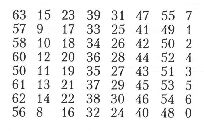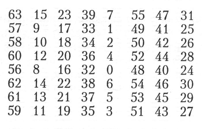 Об алгоритме «мавандуйской цепочки» Придадим триграммам Фу Си значения чисел натурального ряда, соответствующие в десятеричной системе счета их двоичным значениям. Иначе говоря, представим последовательность (e) в виде последовательности чисел — 0 1 2 3 4 5 6 7,