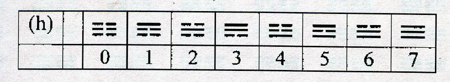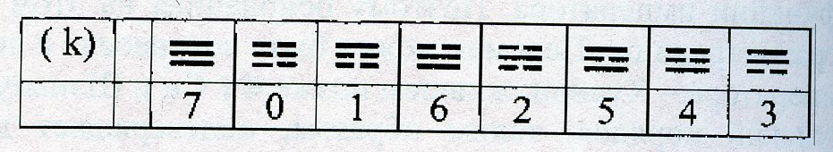 [3]. Символы могут быть заменены натуральными числами: 0 1 2 3 4 5 6 7. Соответствующие дополнительным триграммам пары чисел дадут в сумме 7. В-третьих, последовательность Фу Си может считаться исходной, поскольку всякий отличающийся от правильного, однако приводимый к нему порядок скорей является его модификацией, а не наоборот.