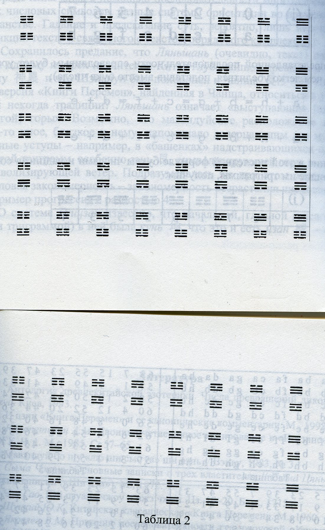 И цзина очевиден, поскольку левые триграммы в печатной публикации текста (на свитке они верхние; см. [15]) повторяются по восемь раз подряд, и восемь рядов из восьми знаков можно расположить в столбик. Такое расположение будет аналогичным квадратному расположению Шао Юна, какое, вместе с круговым расположением прислал в свое время Лейбницу работавший в Китае миссионер-иезуит, преподобный Иоахим Буве (12, S. 170).
