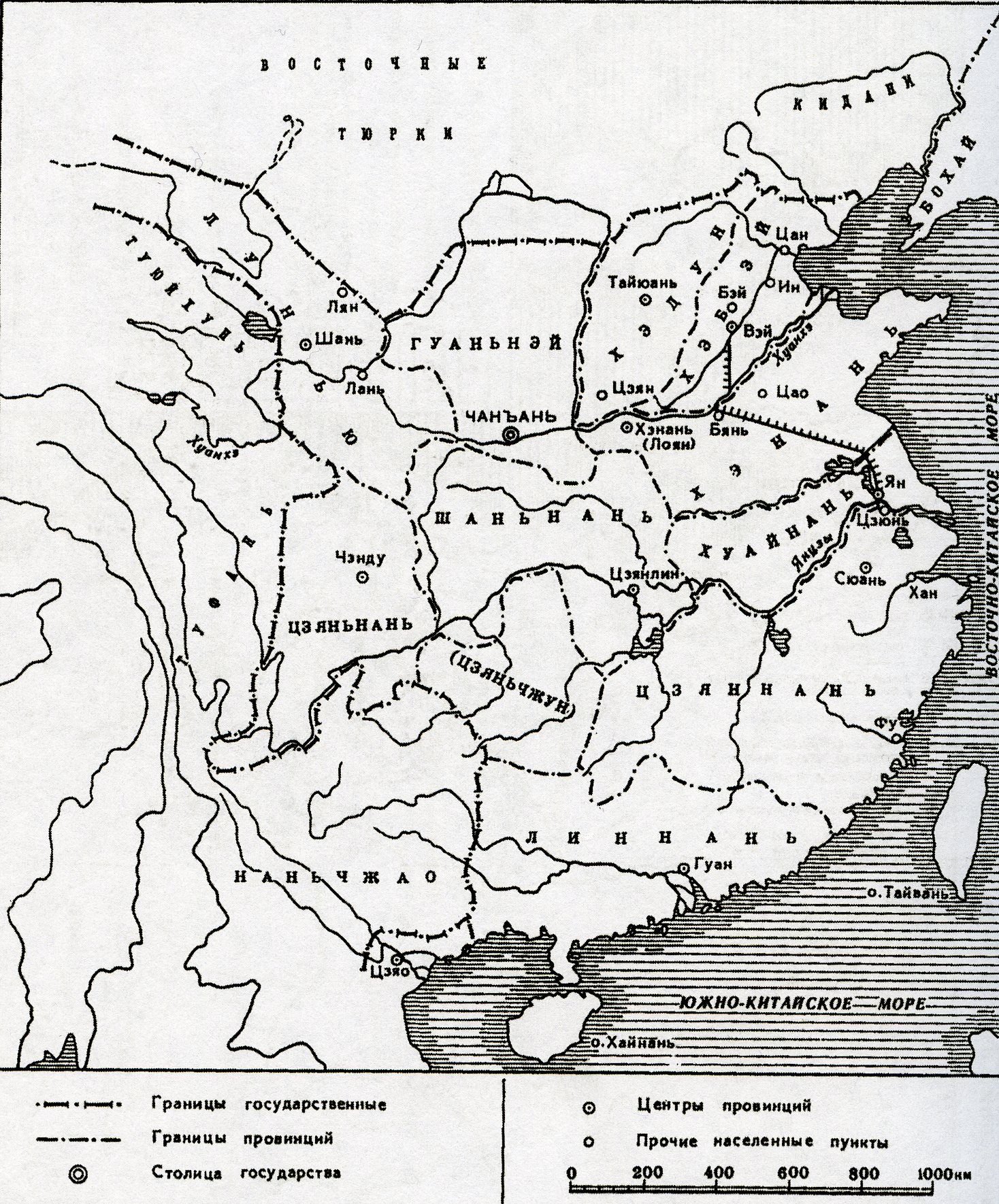 Империя Тан около 750 г. Карта опубл.: Духовная культура Китая: энциклопедия: в 5 т. / гл. ред. М.Л. Титаренко; Ин-т Дальнего Востока. — М.: Вост. лит., 2006–. Т. 6 (дополнительный). Искусство / ред. М.Л. Титаренко и др. — 2010. — 1031 с. С. 1030.
