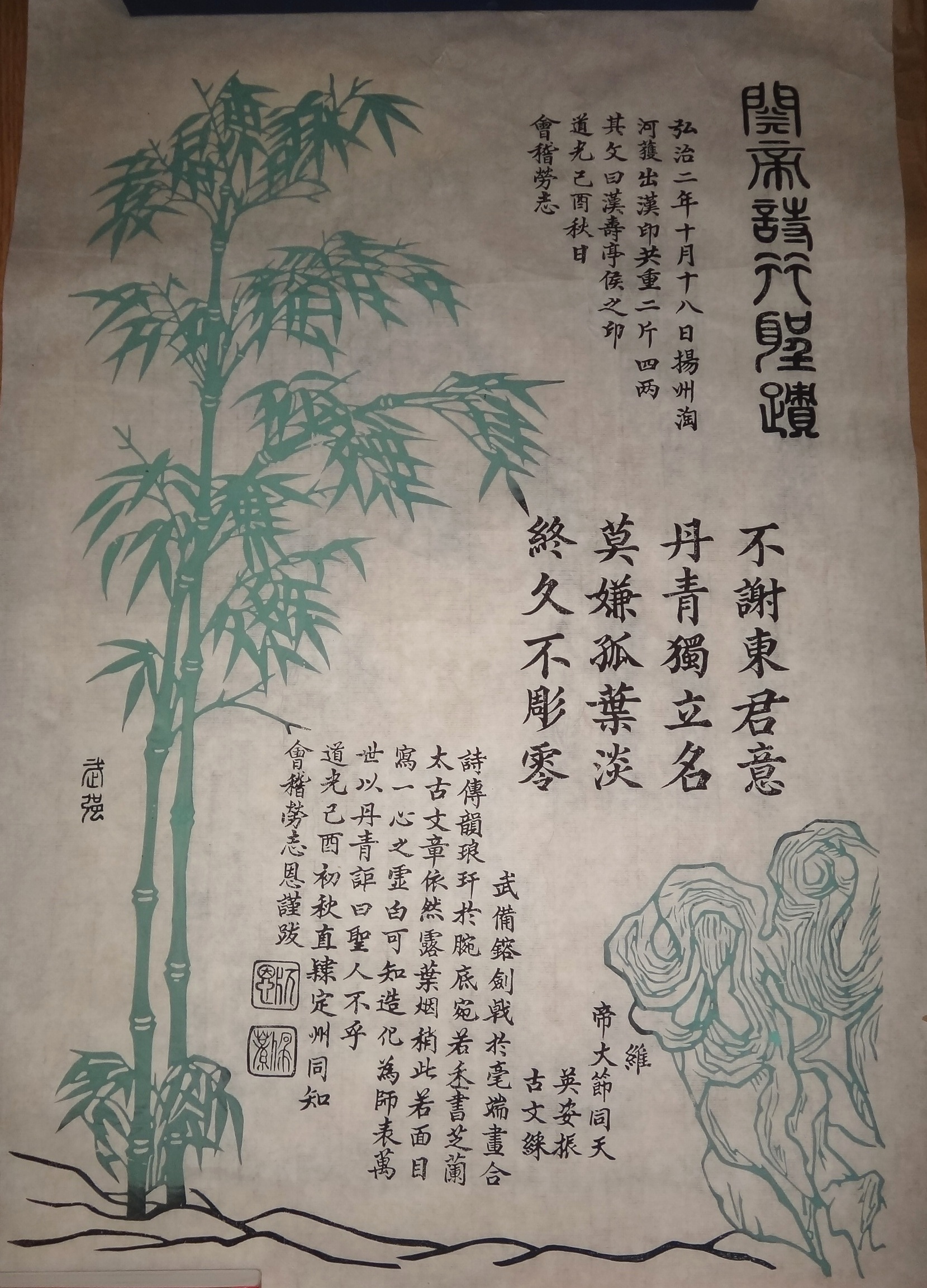 Гуань-ди ши чжу шэн цзань 关帝诗竹圣赞, «Стих о Гуань-ди, [сокрытый] в [листьях] бамбука, восхваляющий совершенномудрого»). На вертикальном свитке – стихотворение и классический пейзаж. Издавна высокая поэзия, визуализированная символами-образами, объединяя искусство каллиграфии и живописи, формировала особое художественное направление в традиционной культуре Китая. Интегративные возможности поэзии были использованы при создании целого ряда жанров станковой живописи, некоторые из них дали импульс для создания отдельных сюжетов китайской народной картины-