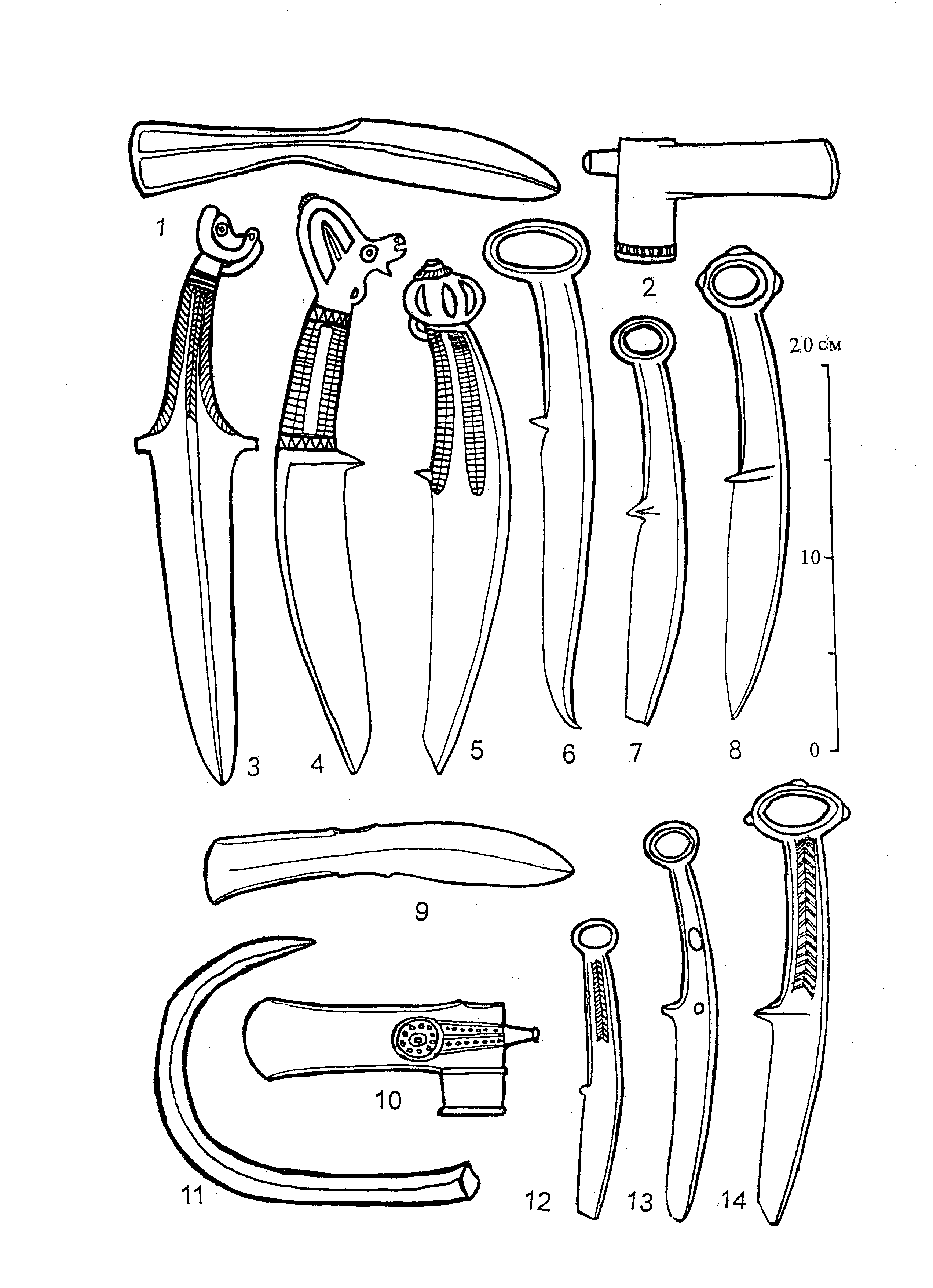 Рис. 1. Комплексы бронзовых изделий из Чаодаогоу и Янхэ: 1–8 – комплекс бронз из Чаодаогоу в уезде Цинлун пров. Хэбэй; 9–14 – комплекс бронз из Янхэ в уезде Синчэн пров. Ляонин; 1, 9 – клевцы, 2, 10 – топоры, 3 – кинжал, 4–8, 12–14 – ножи, 11 – крюк. Все – прорисовки с фотографий. Все прорисовки и сведение к одному масштабу выполнены авторомКогда свыше четверти века назад Н.Л. Членова издала монографию о карасукских кинжалах, со всей современной территории Китая ей было известно только два комплекса с подобными изделиями. Один из них – Чаодаогоу (в написании Н.Л. Членовой везде – «Чаодоугоу», но в китайском оригинале стоит именно иероглиф