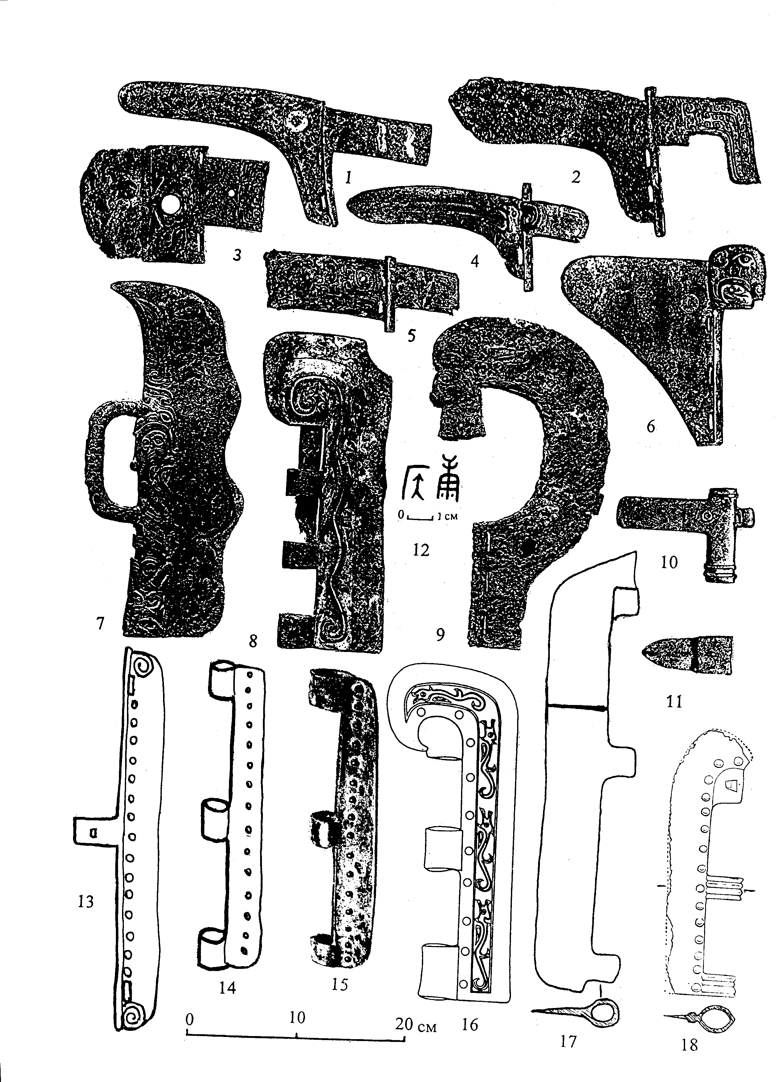 Рис. 2. Комплекс бронзового оружия из уезда Цзюньсянь и аналогии его ножевидной алебарде: 1–12 – комплекс оружия из уезда Цзюньсянь пров. Хэнань; 13 – из Наньгоуцунь уезда Шилоу пров. Шаньси; 14 – из Идэцунь уезда Шилоу пров. Шаньси; 15 – из Хоужэньцзягоу уезда Суйдэ пров. Шэньси; 16 – из погребения М1713 на могильнике в западном районе Иньского городища в Аньяне; 17 – из Идухоучэна уезда Шоугуан пров. Шаньдун; 18 – из погребения М2 могильника Байфу уезда Чанпин в Пекинском округе; 1, 2, 4 – 6 – клевцы; 3 – секира; 7, 8, 13–18 – ножевидные алебарды; 9 – секира с кольцевым лезвием; 10 – боевой топор; 11 – чекан; 12 – надпись на ножевидной алебарде. Все – бронза. 3, 5 – со вставным лезвием из метеоритного железа. Все, кроме 12, даны в одном масштабе. 13, 14 – прорисовки с фотографий. Все прорисовки и сведение к одному масштабу выполнены авторомВ состав набора оружия, закупленного Фрееровской галереей искусств, входили черешковый клевец с двумя прорезями в длинной бородке, инкрустированный у основания бойка кольцом из перламутра и с двумя перламутровыми инкрустациями на обушке (рис. 2:1); черешковый изогнутообушный клевец с двумя прорезями в бородке и треугольным острием бойка (рис. 2:2); черешковый клевец с одной прорезью в короткой бородке, шипом внизу обуха и изображением тигриной морды с оскаленной пастью у основания бойка (рис. 2:4); черешковый прямообушный клевец без бородки, но с одной прорезью, круглым сквозным отверстием в литом орнаменте у основания бойка и встроенным в боек острием, изготовленным из железа, видимо, метеоритного происхождения (рис. 2:5); аналогичная по конструкции бронзовая черешковая секира с лезвием из метеоритного железа и орнаментом в виде маски