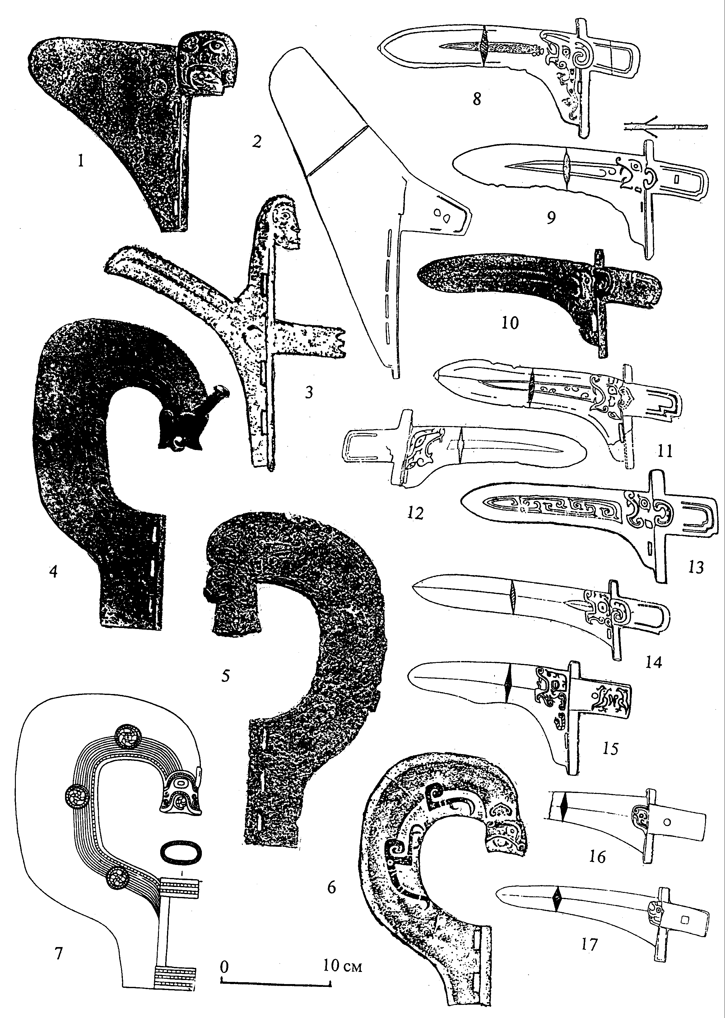 Рис.3. Бронзовые клевцы и секиры из уезда Цзюньсянь и их аналогии: 1, 5, 10 – из уезда Цзюньсянь пров. Хэнань; 2 – из погребения М2 могильника Байфу уезда Чанпин Пекинского округа; 3, 6, 8, 9, 11 – из могильника Байцаопо уезда Линтай пров. Ганьсу (3, 8, 9 – из погребения М2; 6, 11 – из погребения М1); 4 – из Шанхайского музея; 7, 15–17 – из могильника Чжанцзяпо уезда Чанъань пров. Шэньси (7 – из погребения М170, 15 – из погребения К12, 16 – из погребения М110, 17 – из погребения М37); 12 – подъемные сборы на могильнике Сиань уезда Цзяосянь пров. Шаньдун; 13 – из погребения BZM19 могильника Чжуюаньгоу уезда Баоцзи пров. Шэньси; 14 – из погребения М42 могильника Синьцунь уезда Цзюньсянь; 1, 2 – клевцы с треугольным бойком, 3 – трезубец цзи, 4–7 – секиры с кольцевым лезвием, 8–17 – черешковые прямообушные клевцы с короткой бородкой. Все – бронза. Все даны в одном масштабе. Сведение к одному масштабу выполнено авторомОтсутствуют прямые аналогии клевцу из уезда Цзюньсянь с треугольным бойком, плавно переходящим в длинную бородку с тремя прорезями и закрытой зооморфной втулкой, охватывающей вершину древка (рис. 2:6). Но в погребении М2 из западночжоуского могильника Байцаопо в уезде Линтай пров. Ганьсу есть трезубец