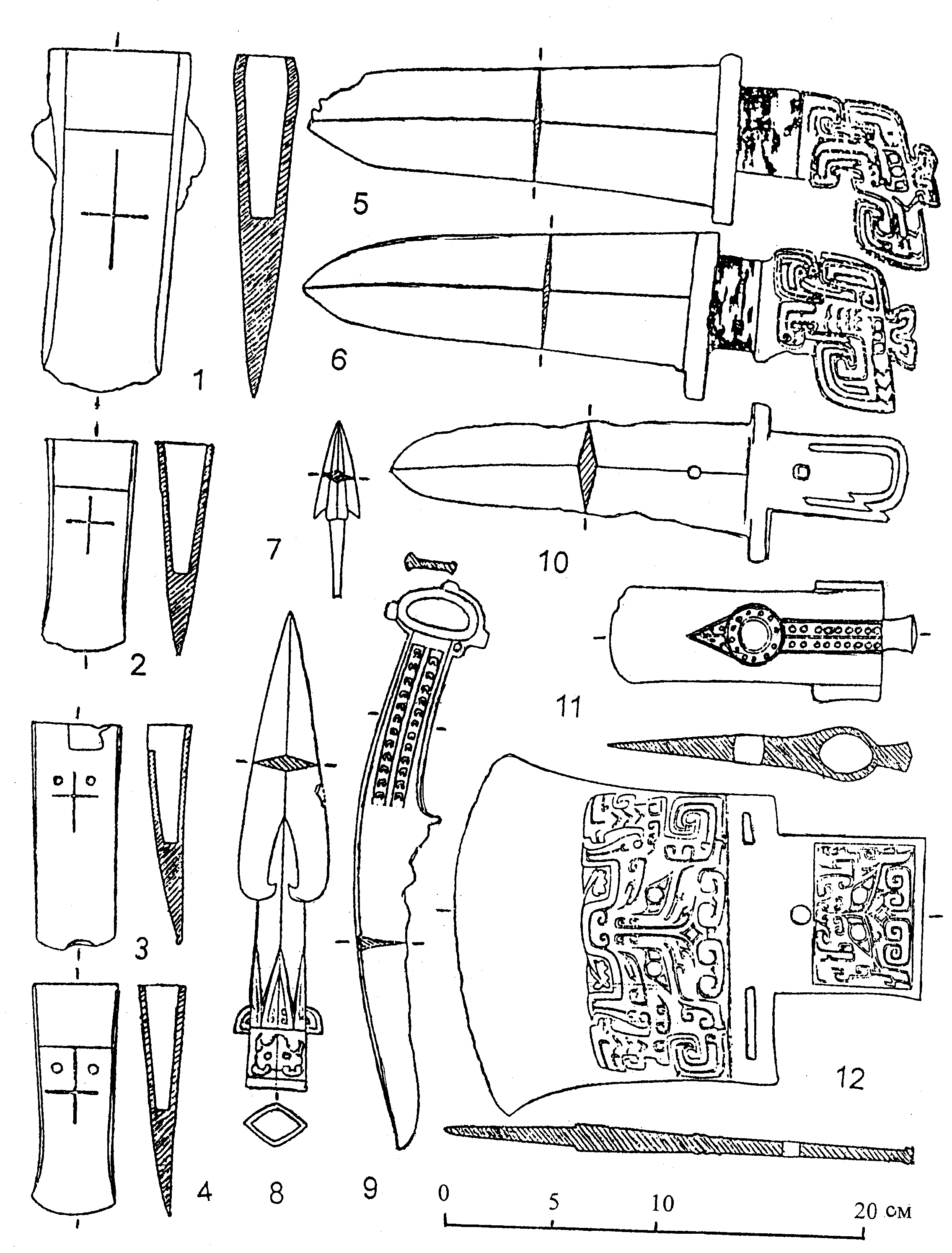 доу и совок, в том числе пять из них с надписями; 72 единицы бронзового оружия и снаряжения, предметы из нефрита, камня, кости. Бронзовое оружие и снаряжение включало 4 кельта, в том числе большой (рис. 4:1) и малый (рис. 4:2) кельты-топоры, и два кельта-тесла (рис. 4:3,4); 13 клевцов, в том числе 12 изогнутообушных с фигурным обухом (рис. 4:5,6) и один прямообушный с закругленным обухом с шипом (рис. 4:10); 50 наконечников стрел с упором (рис. 4:7); наконечник копья бронебойного типа (рис. 4:8); дугообразнообушковый нож «карасукского» типа с овально-кольцевым навершием с тремя выступами и петелькой под навершием (рис. 4:9); боевой топор (рис. 4:11); секиру с обухом и бойком, украшенными маской