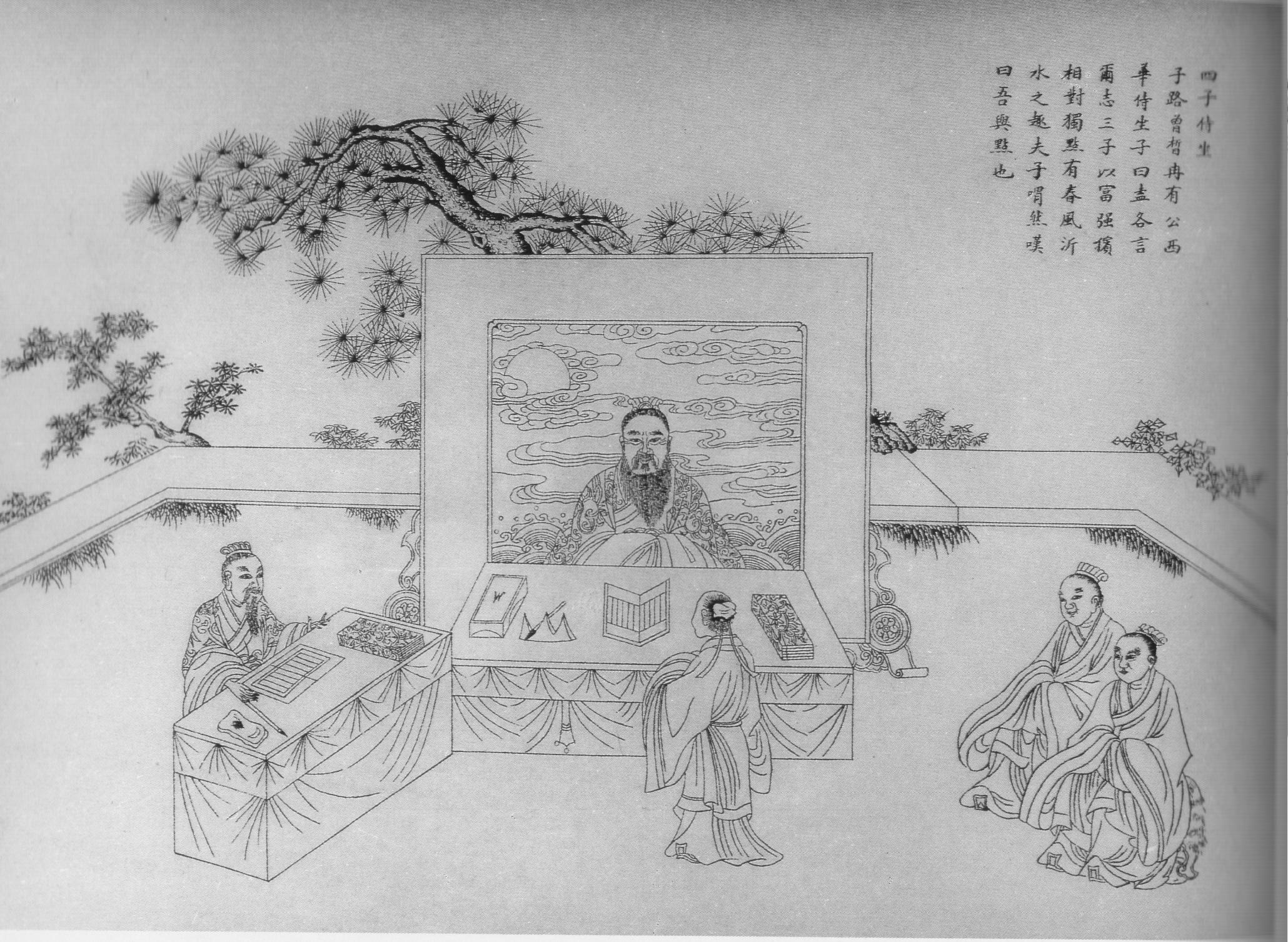 Конфуций с ученикамиКонфуций с ученикамиВзгляды Конфуция нашли аутентичное выражение в составленном в V–IV вв. до н.э. и обретшем совр. форму на рубеже н. э. сборнике сентенций, диалогов, историч. описаний и бытовых сцен «Лунь юй» («Теоретические речи», или «Обсужденные высказывания»), содержащем разнотемные высказывания самого Конфуция, его учеников и их учеников (англ. пер.: L. Giles, 1907; D. Collie, 1828; J. Legge, 1861, 1895; W.E. Soothill, 1910; L.A. Lyall, 1935; Lin Yu-tang, 1938; A. Waley, 1938, 1939; J.R. Ware, 1955; D.C. Lau, 1979; Li T’an-chien, etc., 1991; R. Dawson, 1993; Лай Бо, Ся Юй-хэ, 1994; T. Brooks, 1998; франц. пер.: S. Couvreur, 1895; A. Cheng, 1981; P. Ryckmans, 1987; A. Lйvy, 1994; нем. пер.: R. Wilhelm, 1910; R. Moritz, 1986; итал. пер.: F. Tomassini, 1974; латин. пер.: Ph. Couplet, 1687; S. Couvreur, 1895; пер. на совр. кит.: Ян Бо-цзюнь, 1958; Мао Цзы-шуй, 1975, Се Бин-ин и др., 1980; Тан Мань-сянь, 1982; Ло Чэн-ле и др., 1988; Гоу Чэн-и, Ли Я-дун, 1992; Бао Ши-сян, 1992; Цай Си-цинь, 1994; рус. пер.: В.П. Васильев, 1876; П.С. Попов, 1910; В.А. Кривцов, 1972; И.И. Семененко, 1989; Л.И. Головачева, 1992; А.Е. Лукьянов, 1994; Л.С. Переломов, 1998; А.С. Мартынов, 2000).