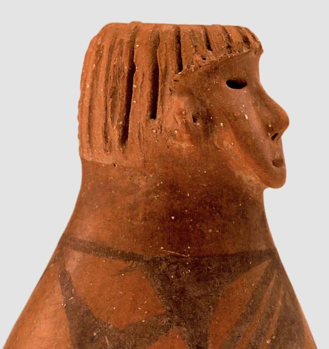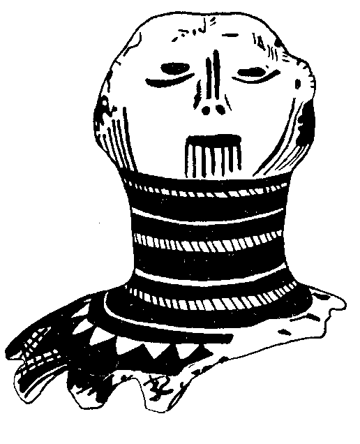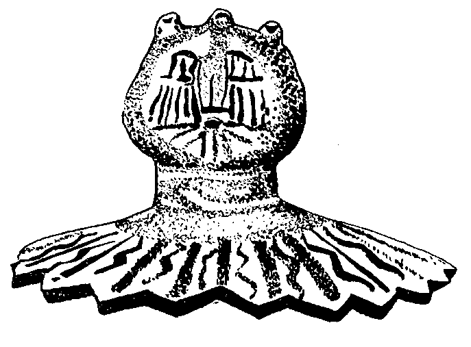 Рис. 3. Крышка сосуда (культура баньшань, вид спереди)Рис. 3. Крышка сосуда (культура баньшань, вид спереди)На лицах фигурок (рис. 1–3), вблизи рта видны штрихи, отходящие вниз и расходящиеся в стороны. Они могут представлять собой изображение надрезов. Рис. 4. Крышка сосуда (культура баньшань, вид сзади)Рис. 4. Крышка сосуда (культура баньшань, вид сзади)Особенно примечательно самое детально проработанное изображение (прорисовка приведена на рис. 3–5, общий вид – на рис. 6). Здесь имеются не только вертикальные «разрезы» в области рта, но и сам рот расширен горизонтальным «разрезом», к нему подходят линии других «разрезов», причём как сверху, от глаз, так и снизу.