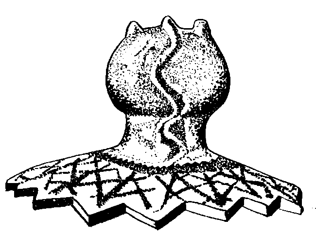 Рис. 14Рис. 14Рис. 13Рис. 13Вариант с «разрезанием» рта рыбы довольно натуралистично изображён на рис. 14. Здесь в пустоте, образовавшейся на месте рта рыбы с двуцветной зональной окраской, ясно видна голова птицы; ниже неё находится какой-то клиновидный выступ, скорее всего, означающий «уский меч», рассекающий рот рыбы.