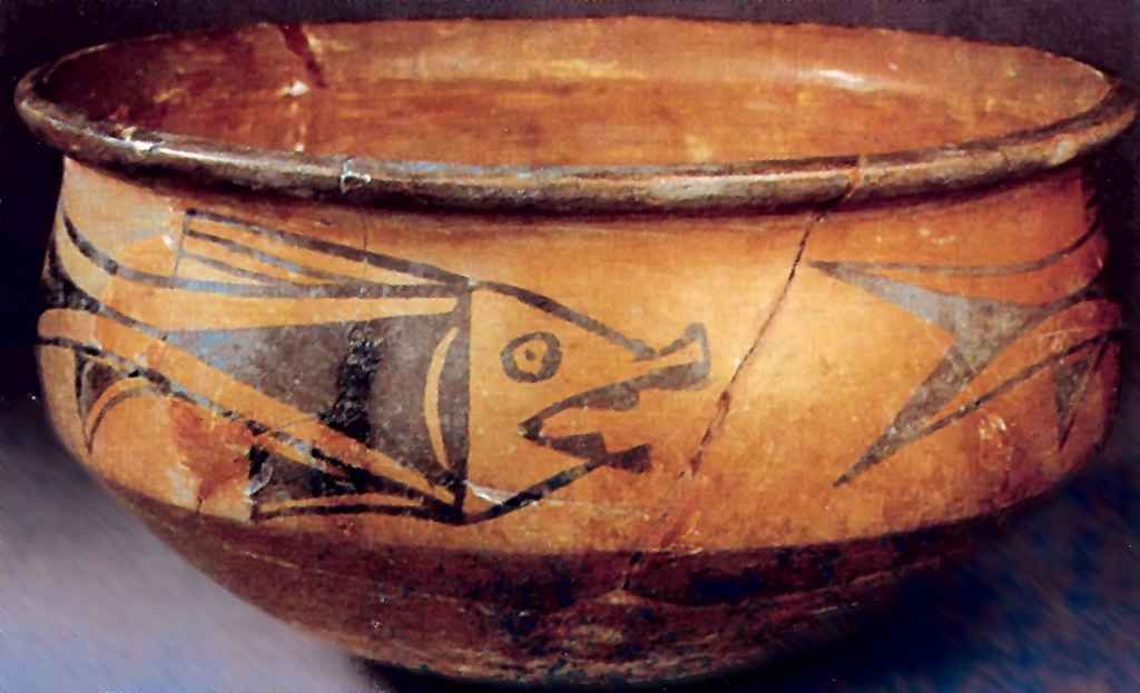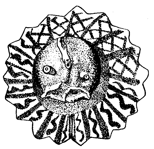 Рис. 5. Крышка сосуда (культура баньшань, вид сбоку)Рис. 5. Крышка сосуда (культура баньшань, вид сбоку)Рис. 6. Общий вид крышки баньшаньского сосуда.Рис. 6. Общий вид крышки баньшаньского сосуда.А есть ли основания считать, что эти линии суть действительно разрезы для расширения рта, а не что-то иное, например, ритуальная раскраска лица или татуировка? Рассмотрим более натуралистичное изображение этого же персонажа, приведённое на рис. 7. Оно было найдено в Хуанлине 翻译, пров. Шэньси, и датируется предположительно ранним периодом Яншао; этот артефакт получил название «голова старика». Рис. 7. Раннеяншаоская «голова старика», найдена в Хуанлине 翻译, пров. ШэньсиРис. 7. Раннеяншаоская «голова старика», найдена в Хуанлине 翻译, пров. ШэньсиРис. 9Рис. 9О родстве этого изображения с рассмотренными нами более поздними яншаоскими «головами» и «фигурами» свидетельствует «впалое» лицо: иногда его делали просто плоским (см., например, рис. 3, 6) или достаточно натуралистичным, полагая, вероятно, что символической раскраски тела вполне достаточно для идентификации образа (рис. 8 а, б; отметим, что в этом случае глубокие насечки имеются на поверхности головы фигурки – намёк на «рождение из головы»?); отметим, однако, ещё одну интересную деталь – на неолитических орнаментах рыбы, которых мы считаем изображением космической рыбы Гуня, нередко воспроизводятся с плоскими, как бы сплющенными спереди, «мордами» (см. рис. 9).