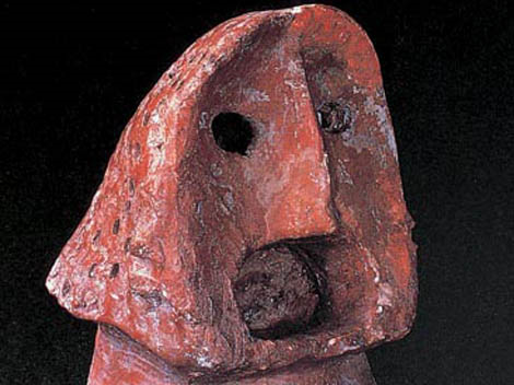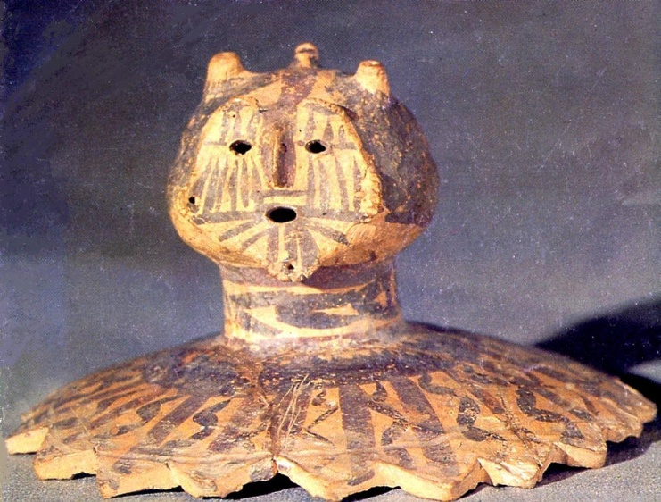 Рис. 1. Крышка сосуда (культура баньшань)Рис. 1. Крышка сосуда (культура баньшань)Однако вернёмся к «ускому мечу». Знак у 吳 обозначал не только древнее царство У, но и широко открытый рот[10], огромное отверстие. Выражение уцюань 吳泉 имело то же значение, что и юйюань 虞淵 ‘место ухода солнца за горизонт’, и означало, вероятно, ‘проход к [Жёлтым] истокам’. Рис. 2. Крышка сосуда (культура баньшань)Рис. 2. Крышка сосуда (культура баньшань)Опираясь на вышесказанное, предположим, что выражение у дао 吳刀 означало «расширить рот [при помощи] меча (ножа?)». Тогда, Юй появился не из рассечённого корпуса, а из рассечённого рта Гуня. Представления о рождении («выплюнула»), равно как и о зачатии через рот («проглотила»), были чрезвычайно распространёнными в мифологии и фольклоре этнографически описанных обществ. Остановимся на предположении о рождении Юя через рассечённый рот. Есть ли у нас основания для такого предположения, кроме предложенной трактовки знака у 吳? Такие основания есть. Сначала обратимся к антропоморфным неолитическим скульптурам, служившим крышками для ритуальных сосудов (Рис. 1–7).