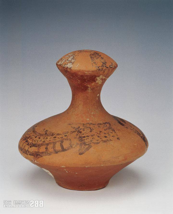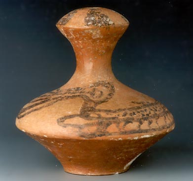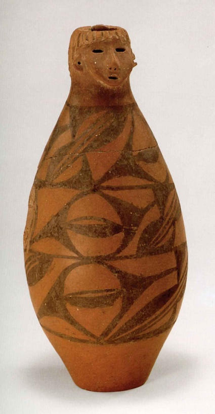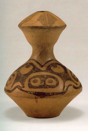 Рис. 17. Сосуд <em>пин </em>瓶 с орнаментом, предположительно символизирующим рождение Юя изо рта Гуня.Рис. 17. Сосуд пин 瓶 с орнаментом, предположительно символизирующим рождение Юя изо рта Гуня.Есть ли избражения того, как из разрезанного тела или рта Гуня появляется Юй? Да, мы полагаем, что и эта часть мифа нашла отражение в неолитическом искусстве. Речь идёт о расписной бутылочке пин 瓶 с изображением двух существ (рис. 17), судя по размеру и расположению глаз – большого и маленького. Отметим, что аналогичные глаза присутствуют у существ с мужской и женской символикой на нефритовом рубиле, соотносимом нами с «уским мечом» мифа (рис. 16), при этом глаза большего размера принадлежат существу с женской символикой. Наличие в орнаменте мотива с двумя подчёркнуто различными по размеру парами глаз можно считать маркером мифа о Гуне, а именно той его части, где говорится о выходе Юя из тела Гуня (через разрезанный рот) или о священном браке Неба и Земли. Такого рода маркеры с «глазами» были чрезвычайно распространены в приморских культурах, особенно в Лянчжу.