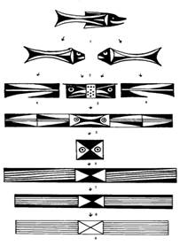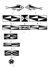 Рис. 11а. Предполагаемая эволюция мотива рыбы на яншаоской керамикеРис. 11а. Предполагаемая эволюция мотива рыбы на яншаоской керамикеРис. 11б. Предполагаемая эволюция мотива рыбы на яншаоской керамикеРис. 11б. Предполагаемая эволюция мотива рыбы на яншаоской керамике«Двухчастное» символическое деление изображения (как правило, с использованием максимально контрастных чёрного и жёлтого цветов) присутствует и на изображениях китайского неолита – в первую очередь, на яншаоских изображениях рыб (чёрно-жёлтый, нередко «шахматный» орнамент –  рис 9, 10; см. предлагаемую эволюцию орнамента на рис. 11 а, б).